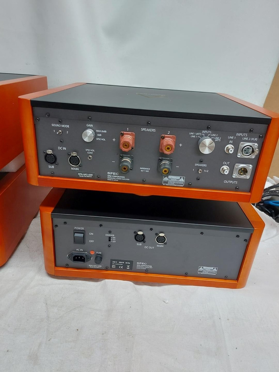 Excellent ex demo with original packaging, cables and manual.12 month guarantee.Here is a 6 Moons review:EC Corporation is a Japanese company founded by Mr. Shirokazu Yazaki, former chief engineer of TEAC and Pioneer, in order to achieve one goal: to provide a tube sound with solid-state amplifiers. The RPA-MG1000 amplifier is its latest and the most expensive product. And it's a Class D one.If we were to adopt an evolutionary theory of changes in audio, we would have to assume that we are moving from less advanced to more advanced designs, in fact—that these are getting better and better. However, as we all know, evolution in our world is not linear, often designers return to older solutions, sometimes redeveloping them, to achieve new, better results.It is worth notice, however—that's my opinion at least—that in many respects a real progress has been made in recent years, in a faster and faster pace. Not in every respect, but still. I believe it is not only my opinion—I just finished reading Isaac Markowitz's Why Do Any of This At All in the Stereophile magazine, in which he concludes his observations about the evolution of his own audio system in this way:When it comes to sound reproduction, it seems that we are light years ahead, compared to where we were 20 years ago. One almost feels that the best products simply pick and reject from music all that is not music—like an electric equivalent of Rodin who sees a marble block as a ready sculpture and all the rest just isn't art.Isaac Markowitz, Why Do Any of This At All, Stereophile 2019, vol. 42 No. 2, p. 138But its is just mine, sorry, our opinion, that you may agree with or not. SPEC and Class DIn this approach, I seem to be an ally of the SPEC—a Japanese specialist, known primarily for its amplifiers. We have already written about the company many times, also about the main engineer of SPEC—now retired—Mr. Shirokazu Yazaki (more in My private history of audio and in the Real-Sound Processor RSP-AZ9EX review).This time, however, I am facing a special challenge—this is the company known so far for excellent, expensive amplifiers, has prepared an amplifier costing even more, the RPA-MG1000—which is one of the most expensive amplifiers on the market. This 60,000 EUR device is nominally a power amplifier, but in fact is an integrated amplifier. We'll come back to that later.The most important fact, apart from the price, is that the SPEC amplifiers operate in class D. In the company materials that I received in May 2013 during the High End Show, when I first met Mr. Shirokazu Yazaki and Mr. Banno Tsutomu—currently the company's chief engineer—I found a meaningful drawing presenting progress: from tube amplifiers, referred to as "the 1st generation," through classic solid-state amplifiers, or "the 2nd generation," up to new amplifiers in the class D, being the 3rd generation of amplifiers in general.And it is not at all that Yazaki-san and Banno-san do not like tubes, in fact they are tube connoisseurs, they design wonderful amplifiers of this type. It is simply that they see the advantages of new technology. In order for them to be utilized and for this to make sense, one should approach the design in the right way and choose the right solutions. For them, the key to achieving top sound from semiconductors is the Class D operation.If we put our prejudices for a moment aside—because there are plenty of poor sounding class D amplifiers—and focus on the basics, maybe it will be easier to understand what I'm going to write about in the "Sound" section.RPA-MG1000I think that SPEC's crew have been fascinated by the simplicity of this type of circuits. But simplicity is something that can easily turn into crudeness. That is why so much attention has been devoted even to the tiniest details in the amplifiers of this company, including the latest monoblocks.A few simple words…SHUZOU ISHIMIPresidentWe/SPEC corp. established in Jan 2010 have developed various products with particular feeling for "REAL SOUND." 2019 is the year of SPEC brand recognition milestone in the 10th year, that is why we launched this model as a new flagship. We put an end to discussion about the class of amplifiers and finally we were able to launch the RPA-MG1000 which took for a year and a half for the development to offer "REAL SOUND" for a lot of music fans of all over the world. People responsible for this design: Banno TSUTOMU-san (on the right) and Yasuhiro YAMAKAWA-san (on the left).We use plenty of naturally derived resources which is not used any other amplifier manufacturers, and everyone can listen natural musicality without tired of listening. The features of D class amplifiers are high efficiency and low heat generation, high dynamic characteristics, strength against backward electromotive current.To take advantage of these features, a wood base vibrating earth structure is adopted the AUSTRIAN SPRUCE and ITAYA MAPLE from Hokkaido of Japan and walnut wood. We also developed and adopted original capacitor "HIBIKI-ICHI" (joint development with Nichikon). Moreover, for sound quality parts, the RPA-MG-1000 has SOSS circuit technology (Spec Original Sound Snubber; more about "snubber" circuits HERE). The very large capacitor is produced from stacked Ruby Mica of State of Bihar in north India. This capacitor produces high quality and high transparency, purity. On the other hand, you can enjoy listening with SPEC original hermetic seal oil condenser if you like it better. RPA-MG1000 flow chartWe would like to listen to the music long time without listening exhausted, can be listen in a well-balanced even with a small volume and also wanted to deliver a realistic sound that makes you want to hear with a bigger sound. These reason why we launched this RPA-MG1000.AttenuatorThe RPA-MG1000 features two line inputs, XLR and RCA. It can operate like a classic power amplifier with an external preamplifier. One chooses this option with a small knob
