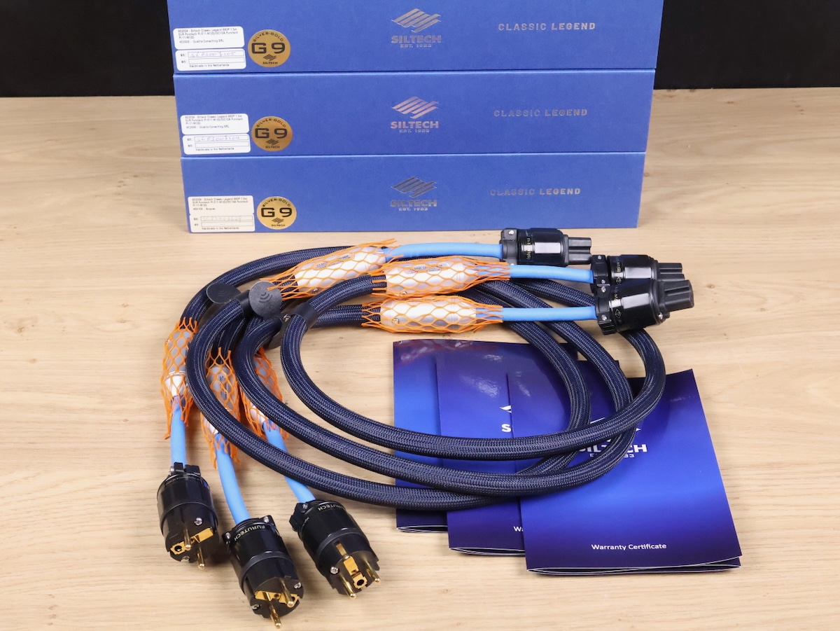 Three Siltech 880P Classic Legend G9 high end silver-gold audio power cable in a fantastic condition. The length of all three is 1,5 metre and they have the original connectors (EU wall type and C15 IEC). The original boxes and certificates are included. Retail price is 2.795 euro, now for 1.649 euro for one 880P cable. Check our other listings for more interesting items. Free shipping worldwide!