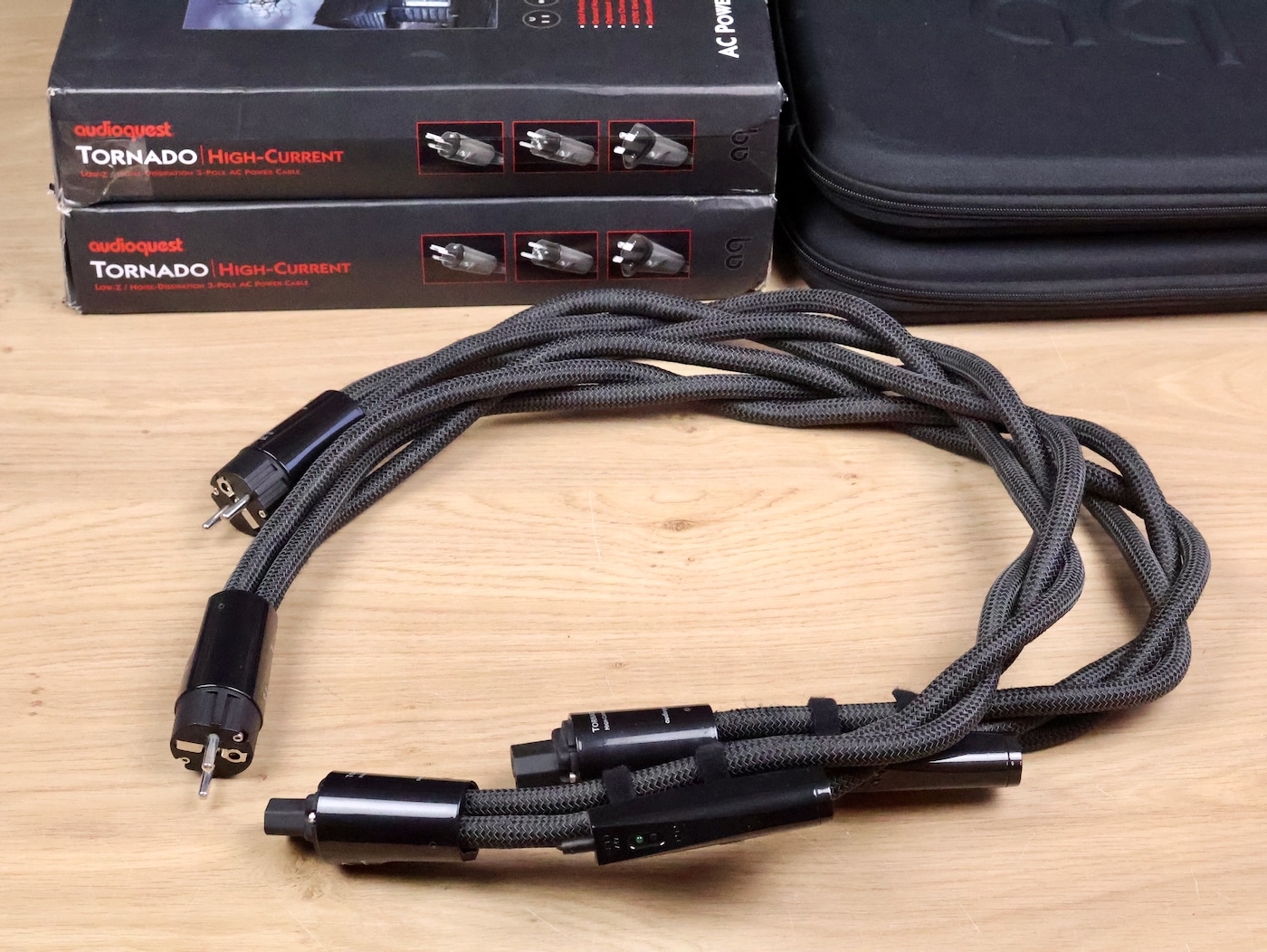 Two AudioQuest Tornado HC High-Current audio power cables in a good condition. The High-Current version is designed for use on all kind of equipment like power amplifiers, preamplifiers, power distributors and digital sources like CD-players and streamers. The length of both is 1,0 metre and they have the original Carbon DBS pack and connectors (EU wall type and C15 IEC).Retail price is 1.449 euro, now for 849 euro for one Tornado cable. The original boxes and cases are included. Check our other listings for more interesting items. Free shipping worldwide!