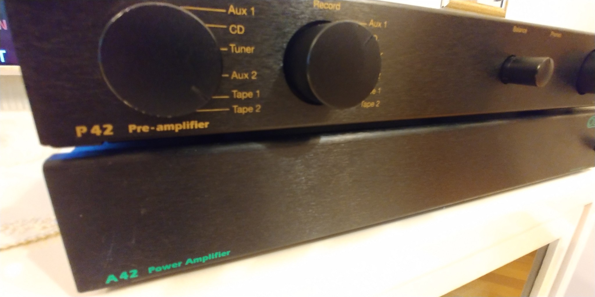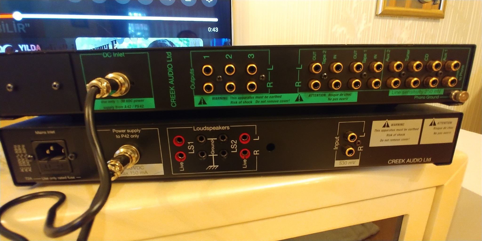 Creek p42 and 42 pre power team. The devices are extremely bug-free and flawless. I had procured the power amp from another user in Turkey, and when I liked the sound, I contacted Mike Creek, the owner of the Creek company from England, and supplied the missing pre floor from his warehouse. A phono card was installed in it on his own recommendation (SEQUEL MK-4 with an additional overseas price of £125), the turntable performance is magnificent. Original intermediate power cable is available. The preamp has outputs for up to three power amps. The power amplifier can be connected to 2 sets of speakers. Power can be doubled in bridge mode by adding another one of the same power amp TheSequel mk4 phono preamp was designed primarily to meet the exacting requirements of the top-of-the-line Voyage i20 Integrated Amp. It can also be plugged into most Creek amps manufactured since 1993! Adjustable phono board suitable for medium/low output MM or high output MC cartridges – 47k Ohm 40dB or 50dB gain, 100/220pF capacitor, IEC tipping, switchable.Features A42 Power output: 8Ω to 50 watts per channel (stereo), 8Ω to 150 watts (mono) Frequency response: 3Hz to 25kHz Total harmonic distortion: 0.03% Input sensitivity: 0.45V Signal-to-noise ratio: 105dB Dimensions: 420 x 60 x 230 mm Weight: 5.3kg