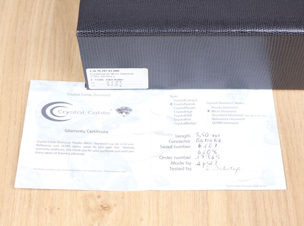 One pair of Crystal Cable Micro Diamond high end audio speaker cables in a good condition. The length is 3,5 metre and they have the original hollow banana connectors. Serial numbers are 06107 and 06108. Retail price is 3.375 euro. The original box and certificate are included. Check our other listings for more interesting items. Free shipping worldwide!