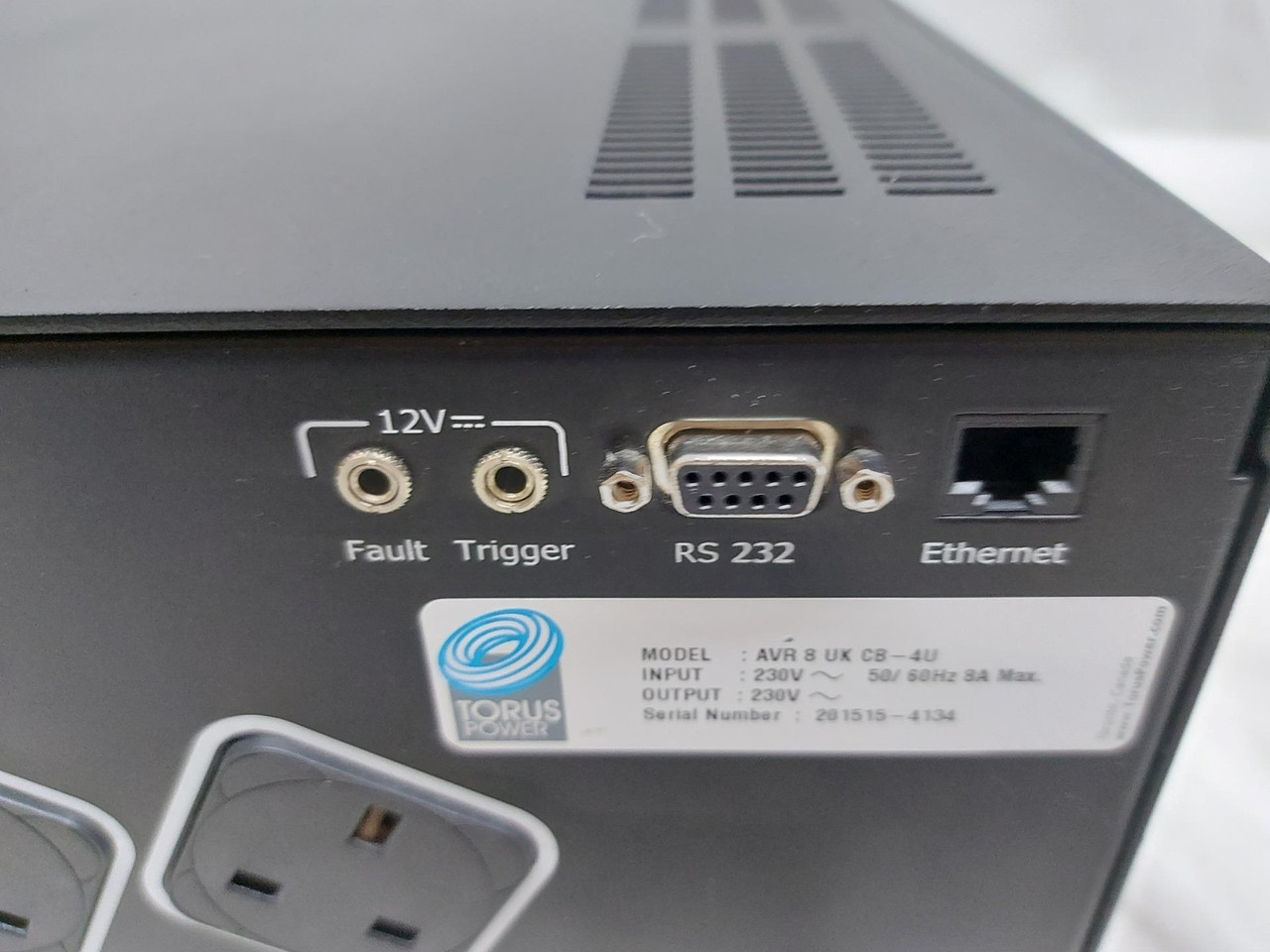 Torus AVR 8 UK Mains Regenerator Power FilterExcellent and boxed.DescriptionTorus Power AVR adds Automatic Voltage Regulation to the standard Torus Power features, thereby enhancing protection against voltage sags, brownouts and surges. Ethernet connectivity and RS232 interface makes AVR models ideal for basic home monitoring applications.Features:Noise Reduction: no external components, patented Plitron transformer performs as low pass filter, attenuating noise from 2kHz to 1mHz, with attenuation of 12 db/decade to >1 meg kHz.Inrush Current Limiting: transformer based inrush attenuation with no external components required.Low Noise Transformer: LONO transformer based technology removes audible power transformer noise under adverse line conditions, including DC offset and over-voltage, with no external components required.Ultra Electrostatic Screen: UST – a highly effective electrostatic screen which capacitively couples high frequency noise to ground while maintaining the best possible inter-winding transfer at power frequencies.Surge Suppression: meets IEEE C62.41-1991: series mode type; built to withstand 6000 volts, 3000 amps for 1000 repeats; with clamping voltage of 2 volts above peak nominal voltage.Interfaces: RS232, Ethernet Connectivity via built-in web browser. Automatic Voltage Regulation (AVR): Maintains stable output voltage of 240VAC ± 10V for any input voltage ranging from 170 VAC to 270 VAC.Output Current: 8ANo. of Outlets: 5Rack Height: 4UWeight: 35.8 kgDimensions (H x W x D): 16.0 cm x 48.3 cm x 48.3 cm