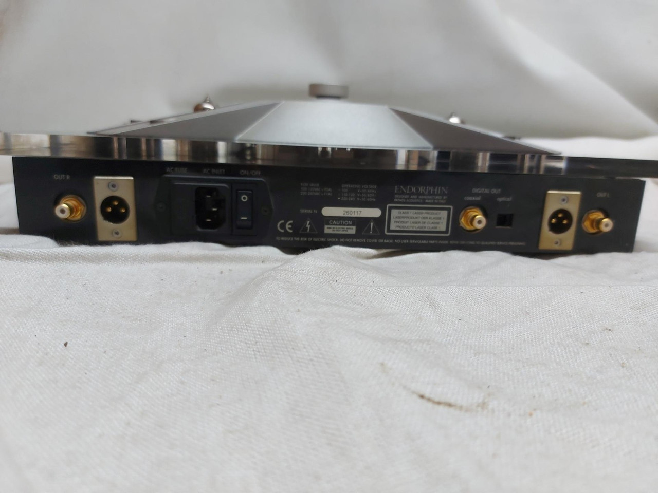 Excellent with remote and original wooden crate.Pathos Endorphin CD Player with As for the ziggurat-shaped Endorphin, which retails for $8000, its aggressively modern appearance is not only a departure from Pathos’ more romanticlooking earlier products, but is also radically different from any other CD player I’ve seen. A model of uncluttered design, the Endorphin adheres to the philosophy of “form follows function.” Having determined that anything but a dedicated CD-only transport would result in a sonic compromise, and being disinterested in the then-ongoing but ultimately moot format war between SACD and DVD-A, Pathos built the Endorphin around the popular Philips CDM Pro transport, which is also used by the likes of Zanden, Audio Research, and others. The ziggurat-ish part of the player is a solid chunk of cast aluminum, a material also found in the clamp that sits atop the disc. These provide mechanical stability to the CD and make a striking visual contrast to the player’s black top, which is composed of clear acrylic layered over black. The clamp itself takes a little getting used to. The first few times I tried to seat it I couldn’t get the player to recognize that it had been fed a disc. But once I began easing the clamp on, gently rolling it from the back onto the front of the disc, I never again caused a glitch. The (manual) flip-up display window adds another nifty touch, as do the five unmarked control buttons, which, once used, are a snap to remember, so intuitive is the layout (Play, Pause, Stop, Forward, Back). Two remotes are supplied—one regular plastic type chock-full of buttons and one custom unit with the same five (still unmarked) function buttons found on the player. A peek at a photo of the unit’s inside layout reveals the Philips transport device and its stainless steel chassis mounts, as well as a toroidal transformer that resides under the transport, an arrangement which is said to aid the player’s mechanical grounding. The analog outputs are mirrorimaged, and a dense field of filter caps is spread across the circuit board, reflecting the Endorphin’s use of 12 independently regulated power supplies. The 24-bit DAC is a chipset from Crystal, with low clock jitter and upsampling to 192kHz. But the main reason Pathos selected this DAC is that it is able to feed a balanced output directly to each of two Russian-sourced 6H30 tubes (one for each channel). This balanced-out capability has generated quite a buzz in the DIY world, and leads to the second Pathos constant: Except for the company’s battery-powered solidstate phonostage, where tubes are too noisy to use with such low-level signals, all Pathos components are zero-feedback, fully balanced, hybrid designs, using a tube voltage-stage and solid-state (MOSFET) current amplification. Leerer also told me that, “Pathos does not use tubes because they sweeten the sound, but because they choose their devices based on what’s best for each application.” And that, he says, also goes for the Endorphin. Although one naturally imagines a sweeter high from tubes than from solid-state (especially with a name like this one), the Endorphin—whether due to tubes or not—is one very sweetsounding compact disc player. This was evident from the first disc I placed in the unit’s top-loading well, Louis Andriessen’s recent opera, Writing To Vermeer [Nonesuch]. As (film writer and director) Peter Greenaway’s libretto imagines it, while the great Delft painter is away from his family, he receives letters from his wife, mother-in-law, and model. Two sopranos and a mezzo sing the roles of the three letter writers, and along with a supporting chorus of women and children the opera is scored for orchestra and electronic music by Michel van der Aa. For lovers of the female voice, this is about as close to heaven as you’ll get outside of Strauss’ Four Last Songs or the Verklärung (Transfiguration) from Wagner’s Tristan und Isolde. In the opera’s dreamy sounding prelude, the Endorphin gave an appropriately airy, slightly soft, almost impressionistic presentation of this quite good recording. The chorus was nicely laid out across a wide soundstage of impressive depth, and Susan Narucki’s soprano was truly beautiful, with excellent projection and the kind of bloom that helps bring recorded music to threedimensional life. These qualities were further supported by one of Harry Pearson’s perennial faves, Howard Hanson’s “The Composer Talks,” from Howard Hanson Conducts… [Mercury], where the Endorphin’s depth, air, three-dimensionality, and large-scale dynamic capability made for a thrilling experience. On terrific live rock recordings, like the Grateful Dead’s Fillmore West 1969 [GD/WEA], I was also taken by the Endorphin’s ability to differentiate the size and ambience of different recording venues, and its way with the tone and texture of bass instruments, from Phil Lesh’s rumbling electric bass to the complex two-drummer arrangement the band used over most of its career. But I also noticed that the overall dynamic range didn’t seem to be as free as I normally hear it, and that the “impressionistic” quality I heard with the Andriessen opera remained. Moving on to avant-garde guitarist Nels Cline’s recent take on the music of Andrew Hill on the CD New Monastery [Cryptogramophone], the Endorphin displayed a wide palette of tone colors with the accompanying cornet, clarinet, accordion, bass, and percussion. Instrumental bodies were nicely fleshed out, with a richly layered if not superweighty bottom end. And Cline’s guitar work was never less than involving,All components have a sonic signature, and in my system I would characterize the Endorphin’s as consistently lovely, rich in color and never dark or thick, with a beautiful harmonic expression, but not the last word in detail, transparency, and dynamic contrast.The Endorphin is an exciting first source component from a 