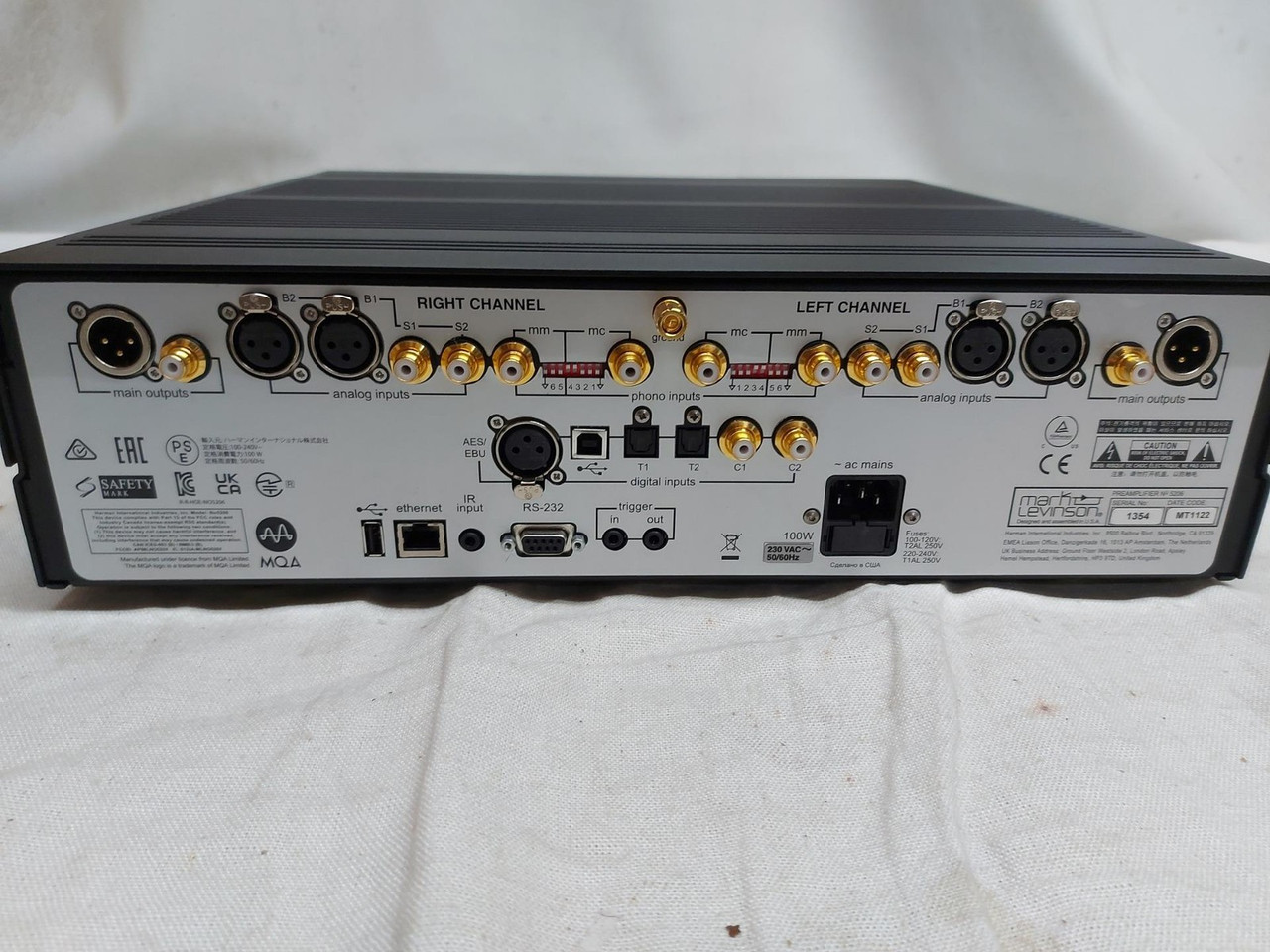 Excellent and boxedHighlightsPure Path class-A analog signal with two awarded patents32 Bit/384 kHz Precision Link II DAC with 4x DSD CapabilityIndependent input relaysClass-A high pass subwoofer filterPremium hybrid topography phono stageSelectable capacitive and resistive load settingsRIAA equalizationMQA Full Decode certifiedDedicated 80VA toroidal transformerExtensive internal shieldingTwo separate voltage regulation stagesDesigned and handcrafted in the USAInputs Moving magnet and moving coil inputsBluetooth audio input including aptX HD supportHome theater processor pass-thru modeOuputs Balanced XLR and single-ended RCA outputsMain Drive class-A headphone outputControl Mark Levinson 5 Kontrol AppCustom aluminum IR remoteIP, RS-232, 12V Trigger In/OutNetworking OTA update capability