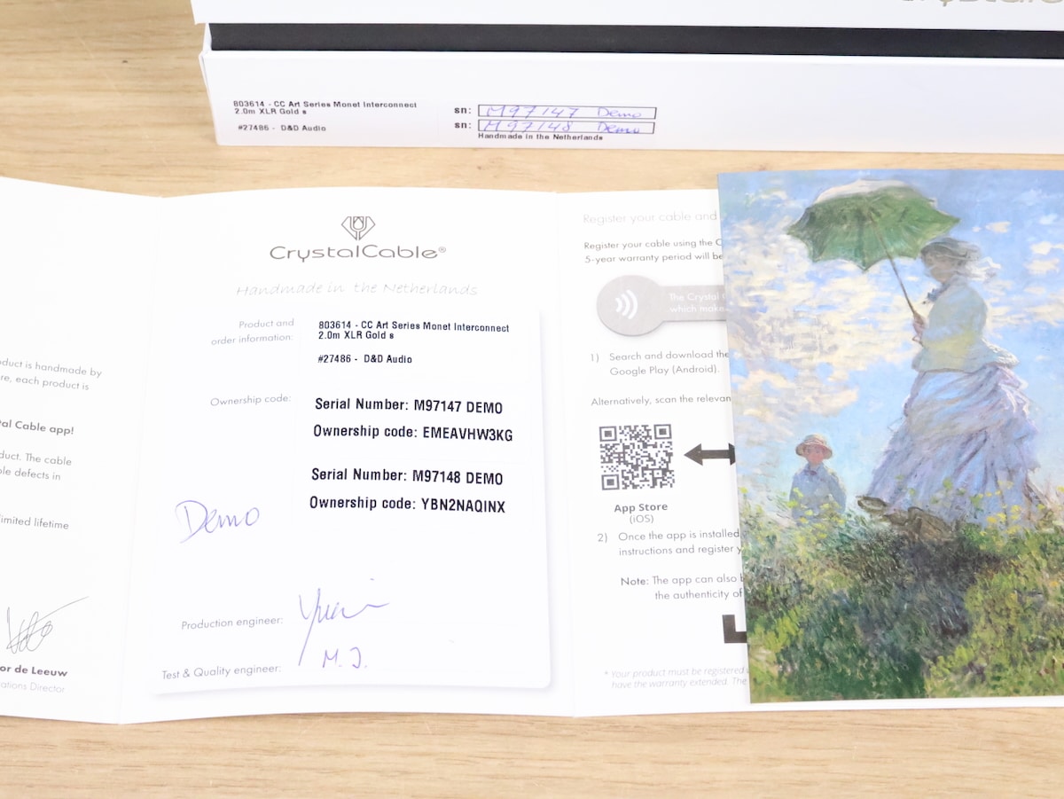 Harika durumda bir çift Crystal Cable Art Series Monet yüksek kaliteli gümüş ses bağlantı kablosu. Uzunluğu 2,0 metre ve orijinal XLR konnektörlerine sahipler. Seri numaraları M97148 ve M97149'dur. Perakende fiyatı 15.125 euro. Orijinal kutu ve sertifika dahildir. Daha ilginç ürünler için diğer ilanlarımıza göz atın. Dünya çapında ücretsiz kargo!Monet, son derece düşük distorsiyon seviyeleri ve olağanüstü müzikal yeniden üretime sahiptir. Optimal iletkenlikleri ve bozulma eksikliği daha fazla detay sunar.