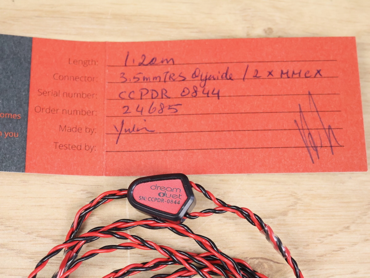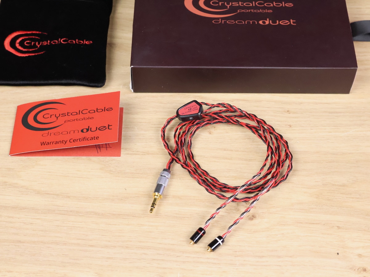 One Crystal Cable Portable Dream Duet silver high end audio headphone cable in a fantastic, like new condition. The length is 1,2 metre and it has the original connectors (Oyaide 3.5mm TRS to 2x MMCX). Serial number is CCPDR0844. Retail price is 1.999 euro. The original box and certificate are included. Check our other listings for more interesting items. Free shipping worldwide!Dream Duet uses 18 “hair-thin” strands of ultra-high-purity monocrystal silver per conductor around a Kevlar fiber core. Dream Duet is fast and resolute. Transients zip across the soundstage effortlessly, leaving no smearing or congestion. The midrange and lower-midrange are velvety smooth and detailed. There’s a feeling of warmth, but there is no muddiness. Sometimes an excess of warm textures can leave a sort of silk cloak around the sound field, acting as a filter. That is not the case here. Dream Duet vividly and masterfully captures the natural tonality of vocals and instruments. Crystal Cables has produced a winner in Dream Duet, sonically and physically. Having such a lightweight and pliable reference-level cable is a serious treat for any headphone enthusiast.