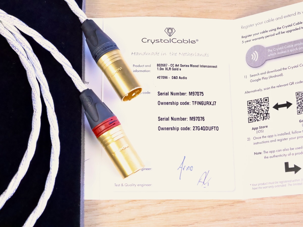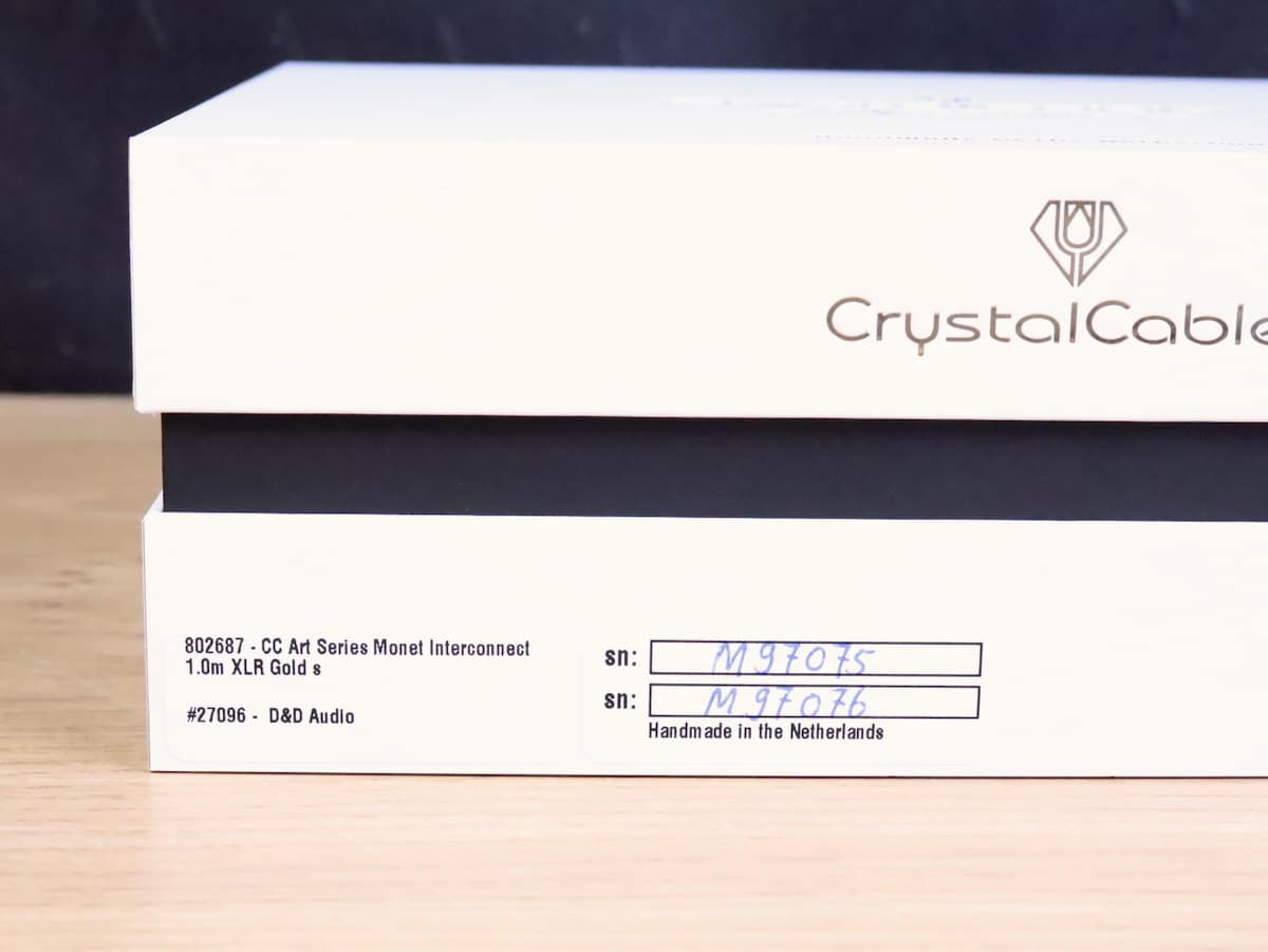 One pair of Crystal Cable Art Series Monet high end silver audio interconnect cables in a fantastic condition. The length is 1,0 metre and they have the original XLR connectors. Serial numbers are M97075 and M97076. Retail price is 9.075 euro. The original box and certificate are included. Check our other listings for more interesting items. Free shipping worldwide!Monet boasts extremely low levels of distortion and outstanding musical reproduction. Their optimal conductivity and lack of distortion result in more detail.