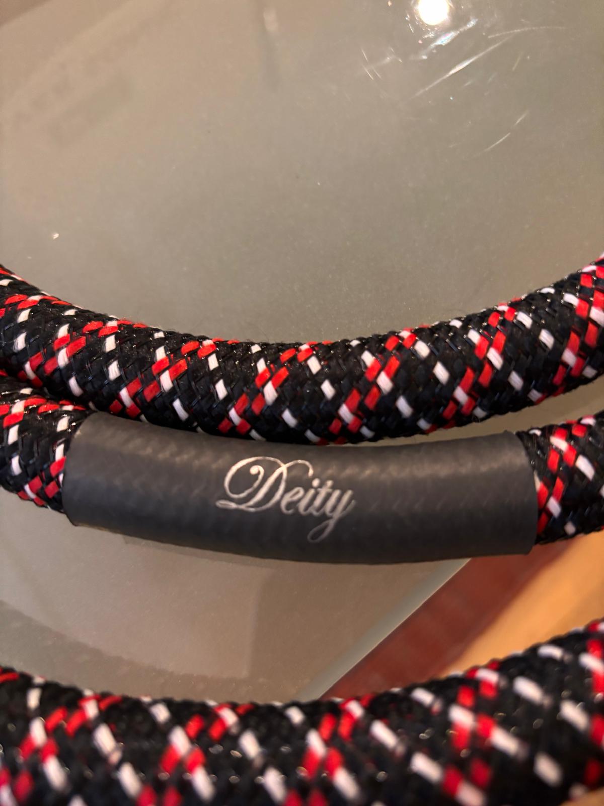 iletkeni (14 awg) kapsayan, iç içe geçmiş sarmal bir dizide 12 adet ayrı ayrı yalıtılmış saf gümüş iletken (20 awg) sunar. DH Labs'ın uzay çağı Air-PTFE dielektriği, her bir iletkenin etrafına bantla sarılmıştır ve piyasada bulunan herhangi bir kablonun en düşük dielektrik kaybını sunar. Deity, gümüş uçlu veya muz uçlu olarak sunulan, çarpıcı derecede çekici bir kablodur. ABD'de üretilmiştir.