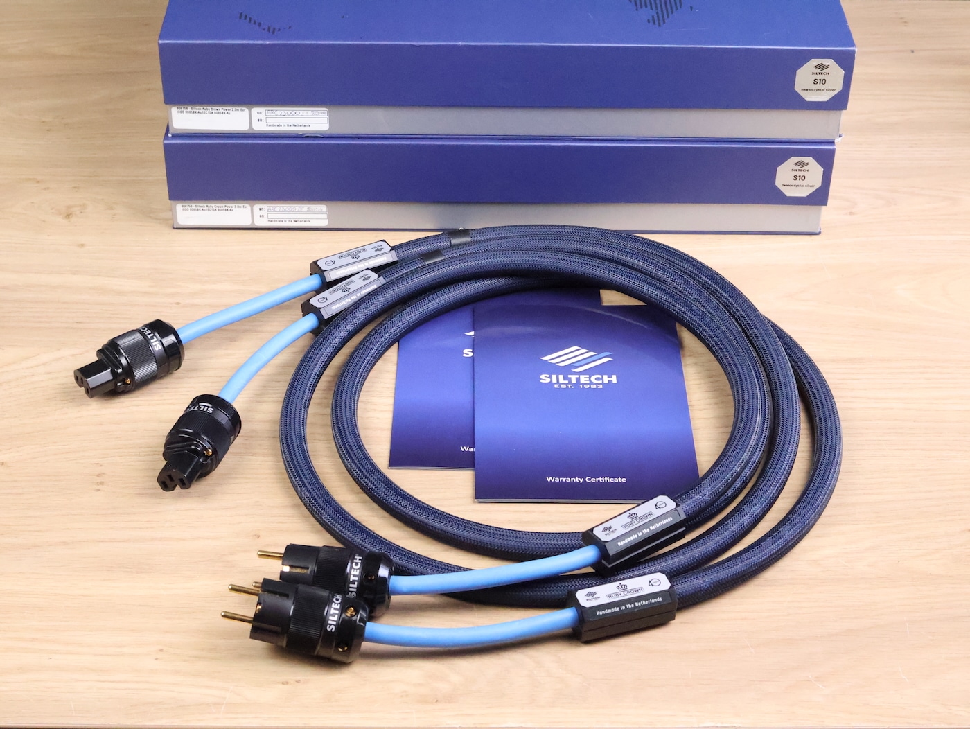 Two Siltech Ruby Crown S10 40th Anniversary high end audio power cables in a very good condition. The length of both is 2,0 metre and they have the original connectors (EU schuko wall type and C15 IEC). Retail price is 5.495 euro, now for 3.199 euro for one Ruby Crown cable. The original boxes and certificates are included. Check our other listings for more interesting items. Free shipping worldwide!Siltech’s newest S10 monocrystal silver is the pinnacle of the cable design and manufacturing. The single continuous crystal metallurgy eliminates boundaries for the lowest possible distortion. By using proprietary sophisticated annealing processes, they produced larger and more consistent crystal structures, reducing the discontinuities in the signal path. The result is exceptional openness, detail, musicality and an extraordinarily realistic sound.