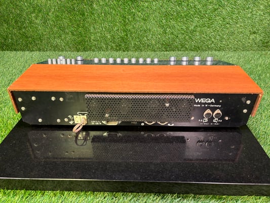The Wega 3105 HiFi is a classic stereo receiver from the early phase of hi-fi development in Germany and was manufactured in the early 1970s. The device combines FM, medium and long-wave tuner, preamplifier section and power amplifier in a flat, functionally designed housing with real wood side panels.Typical of Wega is the reduced, functional design with a clear scale display and logically arranged controls. The front offers separate controls for volume, balance and tone control and a clear station tuning with scale illumination. In addition, several buttons are available for band selection and operating modes.The integrated tuner covers FM, medium wave and long wave and is equipped with a finely resolved scale. The reception section allows precise tuning and offers a separate display for stereo reception. The power amplifier is discreet and designed for operation on speakers with 4-8 ohms.On the back there are connections for speakers, antenna and high-level inputs. The power supply is internal, the power cord is permanently connected. The device is designed for stationary use in the living room.The Wega 3105 HiFi offered here has been technically tested. Reception, amplifier function, source selection, volume and sound control work properly. The optical condition is fully documented on the basis of the high-resolution original images. Technical condition perfect, unless expressly stated otherwise. All offered devices work completely and are sold with a 12-month warranty. Technical data and information (without guarantee): Device typeStereo receiverReception rangesF, MW, LWPower outputapprox. 2 × 15–20 W into 4–8 OhmAmplifier StructureTransistorized, DiscreteSpeaker Connections2 × Screw TerminalsInputsHigh LevelSpecial FeaturesFlat Cabinet, Classic Wega Scale DesignManufacturingMade in W.-Germany Frequently Asked Is the Wega 3105 suitable for daily use?Yes, the device is technically tested and designed for regular operation.Is it a stereo or quadro receiver?The Wega 3105 is a classic stereo receiver.Are original parts installed?The device is in true to original condition with no noticeable modifications. All offered devices are in tested, fully functional condition and are sold with a 12-month warranty, unless expressly stated otherwise.