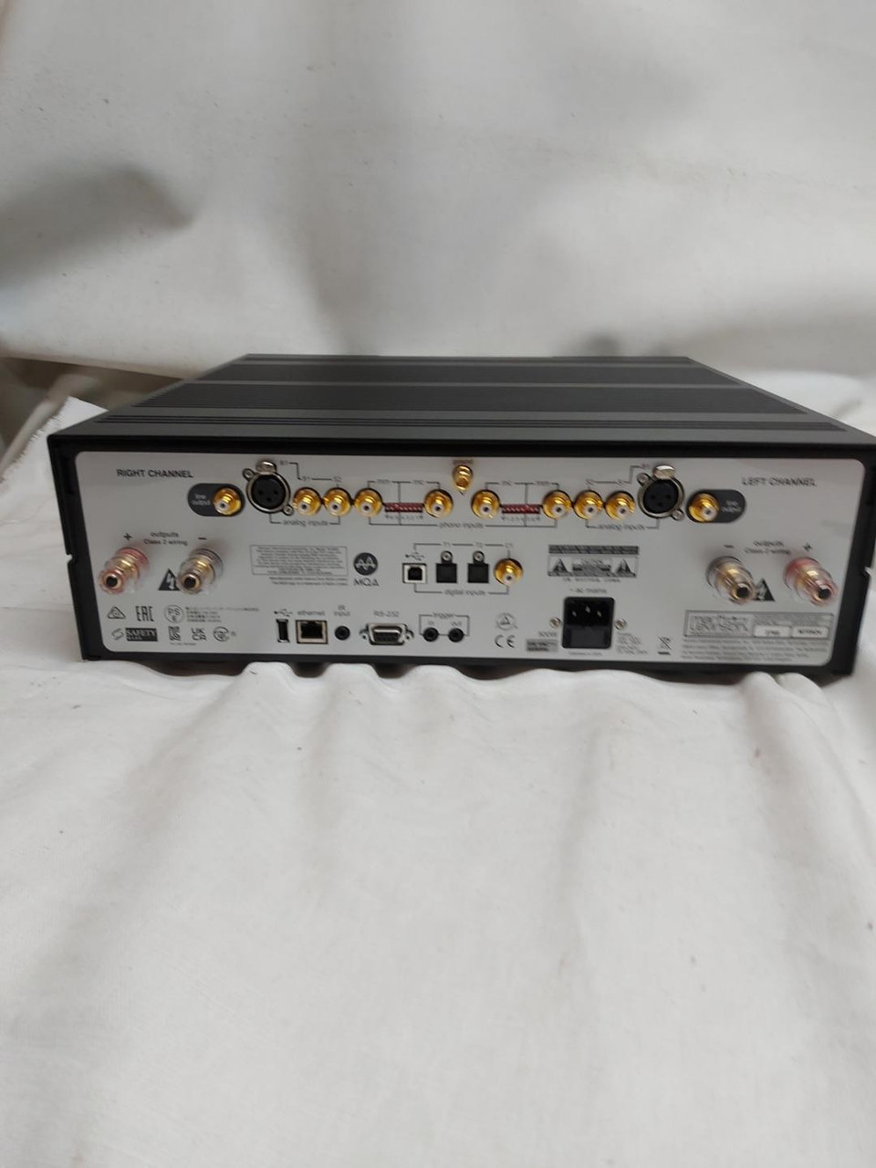 Excellent and boxed.Very good cosmetic condition and full working order.Specs- Line Input Impedance: Bal (XLR): 20kOhms; Single Ended (RCA): 10kOhms- Volume Control: Bal; Voltage Mode; Digitally-Controlled Resistor Network- Gain: 8.5dB Max- Output Impedance: 55Ohms- Output Overload: >4.5V RMS- Freq Response: 20Hz-20kHz, ±0.03dB; <2Hz-210kHz, +0.1/-3dB- THD: <0.01%, 1kHz; <0.03%, 20kHz; 2V RMS output- Signal to Noise Ratio: >96dB (20Hz-20kHz, A-weighted); >93dB (20Hz-20kHz, wideband unweighted)- Input Sensitivity: 53mV RMS at line input for 2.83V RMS at speaker output, max volume- System Gain: 34.5dB, Line input to speaker output, max volume settingPhone Stage- RIAA Freq Response: 20Hz-20kHz, ±0.3dB- Infrasonic Filter: Selectable; 20Hz, 1st Order (6dB/Octave)MM Mode- Input Resistance: 47Ohms- Input Capacitance: Selectable; 20, 70, 120,170pF- Gain: 39dB at 1kHz- THD: <0.01%, 1kHz, 2V RMS output; <0.05%, 20kHz, 2V RMS output- Signal to Noise Ratio: >90dB (20Hz-20kHz A Weighted, referred to 2V RMS Out), >78dB (20Hz-20kHz, wideband, unweighted, referred to 2V RMS Out)- Max Input Level: >6.5mV at 1kHz; >19mV at 20kHzMC Mode- Input Resistance: Selectable, 37 to 1000 Ohms- Gain: 69dB at 1kHz- THD: <0.01%, 1kHz, 2V RMS output; <0.06%, 20kHz, 2V RMS output- Signal to Noise Ratio: >71dB (20Hz-20kHz A Weighted, referred to 2V RMS Out), >66dB (20Hz-20kHz, wideband, unweighted, referred to 2V RMS Out)- Max Input Level: >6.5mV at 1kHz; >19mV at 20kHzDAC Stage- Output Voltage: 5.7V RMSat Max Volume- Freq Response: 20Hz-20kHz, +0/-0.2dB (192kHz/24 Bit); 20Hz-20kHz, +0/-0.05dB (44.1kHz/16 bit)- THD: <0.0025%, 20Hz-20kHz, at 3V RMS Out (192kHz/24bit); <0.003%, 20Hz-20kHz, at 3V RMS Out (44.1kHz/16bit); <0.006%, 90kHz, at 3V RMS Out (192kHz/24bit)- Signal to Noise Ratio: >100dB (20Hz-20kHz, 192kHz/24 bit, A weighted); >98dB (20Hz-20kHz, 192kHz/24 Bit, wideband, unweighted); >94dB (20Hz-20kHz, 44.1kHz/16 bit, A weighted); >92dB (20Hz-20kHz, 44.1kHz/16 Bit, wideband, unweighted);- Sample Rates/Bit Depth: PCM: 32, 44.1, 48, 88.2, 96, 176.4, 192, 352.8, 384kHz; up to 32 bits; DSD Native or DoP; single, double, or quad speed (2.8, 5.6, or 11.2MHz)- Digital Processing: Full MQA decoding; PCM: Seven user-selectable digital filter settings; user selectable up-sampling to 352.8/384kHz; DSD: Four user-selectable digital filter settings.Headphone Output- THD: <0.04%, 20Hz and 1kHz, 2V RMS output, 30Ohms Load; <0.10Hz, 2V RMS output, 30Ohms load- Output Overload: >3.3V RMS, 30 Ohms Load- Signal to Noise Ratio: >91dB (20Hz-20kHz, A weighted, referred to 2V RMS out), >87dB (20Hz-20kHz, wideband, unweighted, referred to 2V RMS)- Output Impedance: <2.5 Ohms, 20Hz-20kHzAmplifier Section- Freq Response: <2Hz-20kHz, +0/-0.2dB; <2Hz-100kHz, +0/-3dB- Signal to Noise Ratio: >103dB (20Hz-20kHz, A weighted); >100dB (20Hz-20kHz, wideband, unweighted)- THD+ Noise: <0.035% at 1kHz, 125W, 8 Ohms; <0.18% at 20kHz, 125W, 8Ohms- Output Power: 125W RMS per Channel at 8 Ohms, 20Hz to 20kHz- Output Impedance: <0.098 Ohms, 20Hz-10kHz; <0.11 Ohms at 20kHz- Damping Factor: >82, 20Hz-10kHz; >72 at 20kHzGeneral- Analog input Connectors: 1 pair XLR, 2 pairs RCA, 1 pair MC Phono RCA, 1 pair MM phono RCA- Digital Audio Connectors: 2 optical Toslink, 1 asynchronous UBS-B, 1 coaxial S/PDIF RCA,- Output Connectors: 1 pair RCA, 2 pairs loudspeaker outs (high current binding posts with banana sockets; accept spade lugs with ¼”/6.3mm spacing up to 1/8”3mm thick)- Control Connectors: 1 RS-232 Port (DB9), 1 IR input, 1 programmable 12V DC trigger out, 1 12V DC Trigger In, 1 Ethernet port- Mains Voltage: 100VAC, 115VAC, or 230VAC- Power Consumption: Max 500W, Green mode <0.4W, Power Save 7WDimensions- Height: 154mm- Depth: 507mm- Width: 438mm28 kg