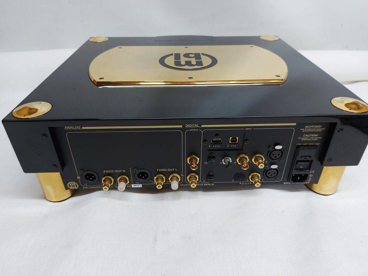 En el mundo digital actual, los consumidores tienen infinitas opciones a la hora de disfrutar de la música. Pueden usar servicios de streaming como Spotify, Amazon, Tidal, Qobuz, Deezer o Apple, por nombrar solo algunos. También pueden escuchar sus listas de reproducción favoritas desde teléfonos móviles, tabletas, memorias USB y, por supuesto, medios portátiles convencionales en formatos CD/PCM. Sin embargo, sea cual sea el formato, todos los dispositivos comparten la misma necesidad: convertir datos digitales de música en el mundo analógico, algo que un microchip diminuto puede gestionar adecuadamente.O puedes pasar de lo adecuado a lo brillante con un peso de 23 kilogramos (50 lbs). Convertidor D/A firmemente plantado sobre pilares de latón macizo mecanizados justo en nuestra propia fábrica; un dispositivo independiente cuyos creadores no han dejado nada al azar: el MBL 1611 F. Bajo la enorme placa cubierta chapada en oro, dos convertidores de gama alta – 1-Bit/Delta-Sigma y Multibit – se encargan de la asignación precisa de los valores analógicos de voltaje a las señales digitales de música. La combinación de las fortalezas tecnológicas de cada conversor crea una sensación fantástica de espacio sonoro y la reproducción meticulosa de los harmónicos más finos, sin comprometer el control estricto de las octavas más graves. Juntos entregan la delicada fragilidad de los pasajes musicales más emotivos, o las notas de bajo atronadoras cuando los datos lo exigen. Utilizando electrónica de salida "de una sola etapa", la señal musical sale del convertidor digital/analógico de la forma más directa, ya sea mediante salidas balanceadas (XLR) o de un solo extremo (RCA), asegurando la menor interferencia posible con pocas superficies de contacto y caminos de señal cortos. La recompensa de este diseño de circuito: una increíble relación señal-ruido de 117 dB.El 1611 F muestra una flexibilidad similar en el lado de entrada. Una impresionante gama de entradas XLR, RCA, Toslink (ópticas) y USB espera señales digitales con resolución de hasta 24 bits y una frecuencia de muestreo de 96 kHz. Para reducir el jitter no deseado que a menudo se asocia con reproductores USB inferiores como ordenadores, teléfonos móviles o tabletas, un excelente reloj maestro se encarga del tiempo y proporciona señales estables de onda cuadrada para un procesamiento preciso del flujo de bits que se avecina. Idealmente, al reproducir CDs, el convertidor recibe sus señales ya perfectamente preparadas en fragmentos pequeños gracias a su socio soñado, el MBL 1621 A de transporte de CD, y sorprende al oyente con una calidad de reproducción inigualable.El cálculo simple, 16 x 6 = 96, representa el rango dinámico de un CD, es decir, la proporción entre el sonido más bajo que puede almacenar un disco y el ruido más fuerte que puede producir, definido en decibelios. Las pistas de audio del CD están codificadas con 16 bits. Cada bit ofrece un rango dinámico de 6 decibelios, lo que supone un total de 96 decibelios de rango dinámico.Uno podría pensar que eso sería suficiente para capturar perfectamente una pieza musical en un archivo digital o grabación en CD, con los niveles más bajos de la música lo suficientemente lejos del ruido y con suficiente distancia de seguridad frente a sobrecargas propensas a la distorsión. Esta es la suposición de los principales fabricantes de chips convertidores digital-analógicos, como AKM, ESS o Texas Instruments (Burr-Brown).Desafortunadamente, la realidad sonora pinta un panorama completamente diferente, especialmente con la música pop, donde las grabaciones saturadas son la norma. Todo productor musical quiere que sus canciones sean fuertes y dinámicas cuando lleguen a oídos del público. Lo que cualquier oyente podría lograr con solo accionar el botón de volumen está incorporado desde el principio por muchos estudios de grabación donde los productores codifican la señal musical de forma dura y rápida al máximo. Esto perjudica la reproducción de música de la más alta calidad. Si varias muestras de un CD se distorsionan completamente una tras otra, los filtros digitales de los convertidores generan formas de onda que se sobrecargan hasta tres decibelios y luego se cortan o "recortan" abruptamente. Las distorsiones desagradables son el resultado audible y medible de esta práctica.Por suerte, este no es el caso del diseño del convertidor de MBL. Con sofisticados sistemas de parada integrados en los filtros digitales, los ingenieros de MBL han creado ingeniosamente una reserva adicional de modulación de tres decibelios, corrigiendo y eliminando básicamente cualquier sobrecarga que degrade el sonido en archivos de CD o música. Lo llamamos Tecnología Verdadera de Punta. Los oyentes lo llaman extraordinario. El resultado es un sonido natural y sin distorsiones procedente de CDs y archivos de música digitales, incluso en niveles de volumen máximo.El MBL 1611 F a simplevista Chasis fresado a partir de un solo bloque de aluminioReproducción natural mediante filtros digitales y analógicos optimizados para retardo de grupoEntrada USB (Clase de Audio 1) con Modo Master Clock para transferencia de datos asíncrona y sin jittersRelación señal-ruido de 117 decibelesCombinación de Delta-Sigma y conversión Multi-BitTecnología True Peak MBL para eliminar inexactitudes de masterizaciónCompañero perfeccionador para la unidad de CD MBL 1621 ALa posibilidad de conectar un PC/Mac/iPhone/iPad vía USB; No se requiere instalación de controladores. Fuentes de alimentación separadas para funciones analógicas, digitales y de pantalla.