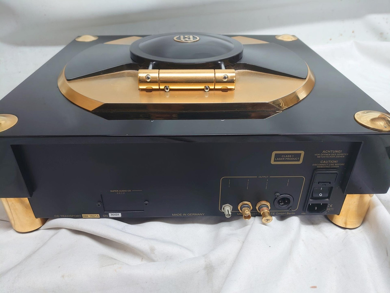 Retails at £16000. With flight case.Time never stands still. Neither does technology, and our “here and now” has seen convention go out the window. In days past, music listening meant lid up, platter spinning, and gently lowering the tonearm onto your favourite vinyl LP – simple steps in anticipation of the pleasure to come; archaic, perhaps, in this digital age of instant gratification.Or maybe today it’s just… different. The gold-plated top of the 1621 A CD drive evokes the form and size of a 12” LP record – awakening expectations in the style-conscious music lover. Simply lifting the air-tight drive cover, machined from a solid billet of aluminium that’s perfectly balanced on an ample hinge, is a tactile experience of its own. Insert the CD, secure it with the custom stabilizer puck, close the cover and prepare to be swept away. Once connected to a well-paired D/A converter, like the MBL 1611 F, a highly stable sound image materializes to deliver a composed, unruffled calm, so often missing from today’s digital sources.Such technical wizardry demands mechanically engineered support that is equal to the task. The CD drive is suspended on a four-kilogram sub-chassis manufactured from three sandwiched metals. The sub-chassis, in turn, is spring mounted on three vibration-damping “pillars” for true base isolation. The disc stabiliser is an acoustically optimised, meticulously crafted device derived from solid brass, aluminium and magnesium. The precision-milled spiral form in the drive cover is more than just beautiful design; it reduces air turbulence in the drive chamber to ensure the stable and error-free rotation of the CD. It is an unparalleled feat of mechanical and electronic engineering that delivers intoxicating music from the laser-etched pits in the aluminum layer of a polycarbonate Compact Disc. When the first notes emerge, you’ll understand. The MBL 1621 A guarantees lasting enjoyment from every CD in your personal collection.The Sound of Silence – the drive chamberA compact disc player can be its own worst enemy! The sound waves from loudspeakers can affect its sensitive pickup sensors, drive parts, and the disc itself with sound damaging resonances. Even the CD, rotating at 200 to 500 revolutions per minute, can create internal atmospheric challenges in the form of air turbulence and further resonances. To mitigate these forces, the drive chamber of the MBL 1621 A is designed with the utmost attention to detail. The massive drive cover with its rubber sealing gasket ensures complete silence in the chamber and a supernaturally calm scanning process. The inside of the hinged lid itself is milled out in a proprietary spiral shape that prevents any disturbing air turbulence.Mass and metal – the drive weightOptimal decoupling from the ambient environment to achieve maximum smoothness – that is the ideal state of a CD drive. And this is where mass is critical: The drive mechanism rests on a massive four kilogram sub-chassis. In order to eliminate possible resonances, it is constructed of sandwich technology utilizing brass, aluminium and Terodem insulation material – all of it suspended at three points on vibration absorbers made of highly damping polyurethane polymer.The resonance frequency is tuned to 13 Hz and thus does not collide with the lowest audio frequency (20 Hertz) or with the highest CD rotation frequency (8.3 Hertz). Thanks to the integrated height adjustment, the drive can be precisely adjusted horizontally like a high-quality turntable.Small presence, huge effect – the drive stabilizerA stabilizer placed on the inserted CD ensures firm contact and smooth running of the disc without vibrations, tremors or pulses impacting the sound. This applies equally to the read quality of the laser unit and, correspondingly, to the final sound quality that is nothing short of impeccable. The solid and astonishingly heavy stabilizer of the 1621 A is the result of extensive material research with countless listening comparisons. A sandwich construction made of brass, aluminium and magnesium, covered with a dampening coating, has proven to be optimal in terms of sound. Two rubber rings, one on the inside and the second on the outer edge, gently but effectively press the CD onto the drive tray for precision contact…and priceless results.The MBL 1621 A at a glanceDevice housing milled from a single block of aluminium.CD Drive positioned on a solid 6 kg (13.2 lb) sub-chassis constructed from brass, aluminium and Terodem, then spring mounted on three points for isolationAdjustable levelling ensures the drive is perfectly horizontalAirtight solid drive cover to protect against external sound influences and rotational resonancesIntricately designed and engineered stabilizer puck holds the CD firmly for smooth performance3-beam laser with high directional stability and maintenance-free positioningToroidal transformer with sophisticated protective shield technology, magnetic shielding by Mu-metal housingBrilliantly designed output transformer cell with an amazing bandwidth of 98.7 MHzSeparate voltage regulator for each of the ten function groupsSymmetrically constructed engine and carriage controlSeparate power supply for digital music signals and digital control signalsGroup-delay-optimised bi-phase signal path for optimum transmission qualityDigital OutputsXLR (AES/EBU)Output Impedance 110 OhmBandwith 40 MHzRCA (S/P DIF)Output Impedance 75 OhmBandwith 40 MHzCD MechanismFormatsStandard Compact Disk (Red Book)Resolution 16 BitSample Rate 44.1 kHzNumber of Channels 2Modulation EFMWeight26 kg / 57 Ibs
