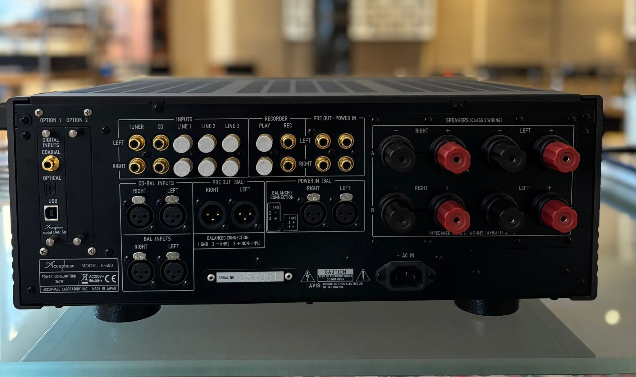 Technical specificationsPower: 8 x 2 watts at 30 Ω, 4 x 2 watts at 60 Ω, 2 x 120 watts at 2 Ω and 2 x 150 watts at 1 ΩInputs: Dac 50 inputs plugged inOutputs: 2 pairs of speakers, 1 Pre-Amplifier OutputFrequency response (at 1 Watt): 3 Hz – 150 kHz +0, –3.0 dBDamping factor: 800 (EIA, 8 ohm load, 50 Hz)Input sensitivity: 77.7 mV (HIGH LEVEL), 0.617 V (POWER INPUT)S/N ratio: 102 dB (HIGH LEVEL), 117 dB (POWER INPUT)Consumption: 290 wattsDimensions and WeightsDimensions: 465 x 191 x 428 mm (WxHxD)Weight: 25.3 kg
