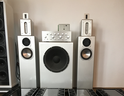 Modular speaker system with the finest equipment! - Active subwoofer with 15" bass driver from JBL (modified) with integrated 20kg Class A/B power amplifier from Outsider.- Woofer/midrange driver from "Dr. Podszus" Görlich midrange driver Accuton Thiel ceramic dome (installed in Avalon Opus Ceramique, among others) - Midrange / treble with the large Raven ribbon Raven ribbon All uniformly painted in Mercedes Benz Silver Metallic. The control center is a modified 4-way Pioneer D23 active crossover with numerous adjustment options. We also have the optimally matching Outsider power amplifiers in stock! Of course, the reference speakers can also be driven with other power amplifiers. Due to its adaptability, the Outsider speaker system fits perfectly into room sizes of 20-60 square meters. At this price, you can only get a Dali Epicon 6 or B&W 804D3 etc. on the mainstream used market. Guess who will win the race here :-)