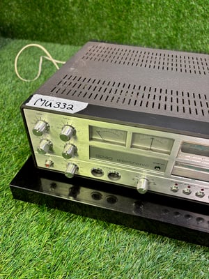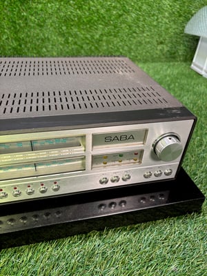 The SABA 9240 electronic stereo receiver belongs to the late generation of SABA receiver development and stands for the transition to electronically controlled switching and operating concepts. The device combines FM receiver, stereo preamplifier and power amplifier in a clearly structured housing and is located above the classic hi-fi studio models.The amplifier part is completely transistorized and follows a conventional, easily comprehensible circuit concept. The output power is designed for operation with loudspeaker systems typical of the time and offers sufficient reserves for use in the living area. Frequency response and distortion values correspond to the technical state of the art of the early 1980s.The input section includes a phono input with RIAA equalization for magnetic pickups as well as several high-level inputs for additional signal sources. Tape inputs and outputs allow the connection of external tape devices. The signal guidance is clear and service-friendly.The integrated FM tuner covers the range from 87 to 105 MHz and is designed for stable stereo reception. The electronic design of the receiver ensures reliable transmitter adjustment and uniform behavior even under changing reception conditions.The tone control is classically designed and intervenes in bass and treble at fixed frequencies. Balance, volume and source selection can be adjusted separately. In addition, the receiver has electronic switching functions that increase the ease of use compared to previous mechanical designs.Speaker connections for impedances from 4 to 16 ohms and a headphone output are available as outputs. The dimensions correspond to the compact format of the late SABA receiver generation.The device offered here has been technically tested. Reception, amplifier function, source switching, balance and tone control work properly. The optical condition is documented in a completely comprehensible way on the basis of the original images. The technical condition is perfect, unless expressly stated otherwise. All offered devices work completely and are sold with a 12-month warranty.