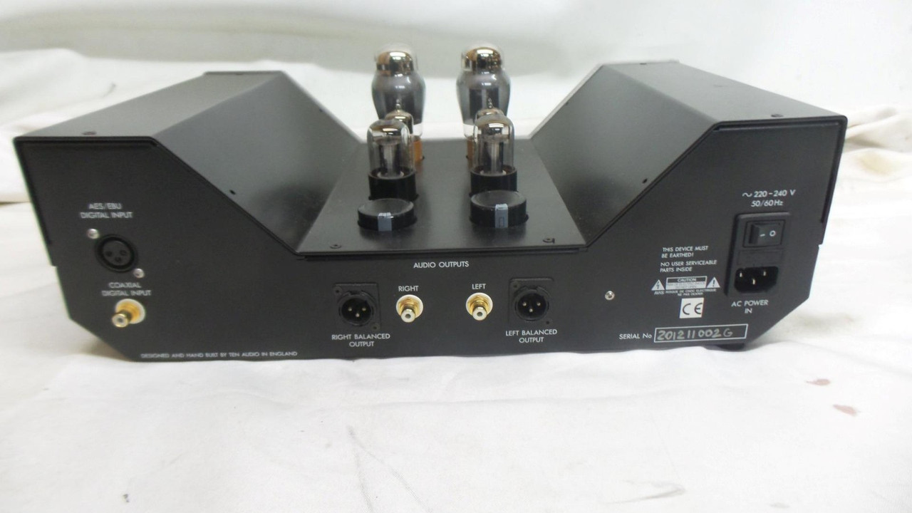 Excellent.Features Designed and hand built in England Specially selected dual DAC chips coupled directly to triode valve output stage Specifically selected 6SN7 x 2 supertriode 6N6P x 2 extremely durable special series EZ35 rectifiers Valve section of the TAD1 is point to point engineered Purpose designed choke loaded anodes power supplies with two valve rectifiers and two Transformers – separate for each stereo channel Full dual mono design Ultra-short primary “signal path” utilising aerospace technology silver wiring No high or low-pass filtering in any part of the audio frequency range No up-sampling of the signal in the digital circuitry and no musical signal alterations in the analogue domain Highest quality, TEN Audio designed “digital “board, fully separate power rails for digital and analogue sections of the DAC`s Separate transformer / PSU for valves filament heating with 68000uF smoothing capacitance Extremely reliable, unique power supplies Built in high quality AC mains filter Specifically selected for TEN Audio paper in oil capacitors and carbon composition resistors Steel and aluminium highest quality monocoque chassis with removable valve cover Ultra durable 6mm thick - laser/nitrogen cut, milled and hand brushed stainless steel front panel SPDIF - RCA COAX and AES/EBU balanced digital inputs Automatic digital signal source recognition 16 and 24bit signal data processing RCA single ended analogue and XLR balanced analogue outputs Output level (gain) control – stepped attenuator built with a non-inductive resistors/gold plated contacts – primarily designed to match the output of the DAC to a wide range of preamplifiers but can also facilitate direct connection to a power amp. REVIEW HERE:hifiwigwam.com/showthread.php?79542-Ten-Audio-TAD-1-DAC