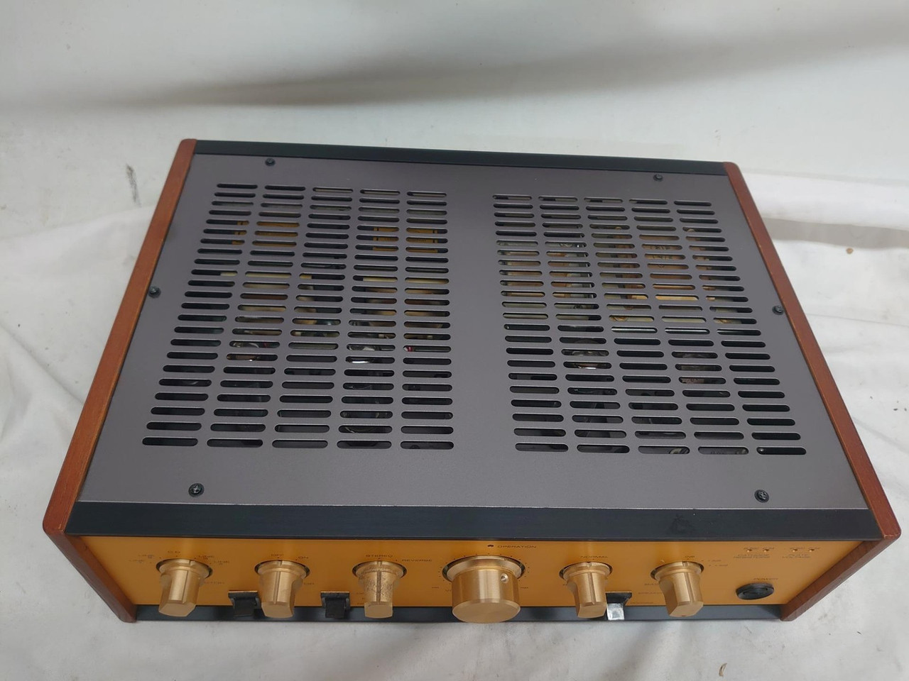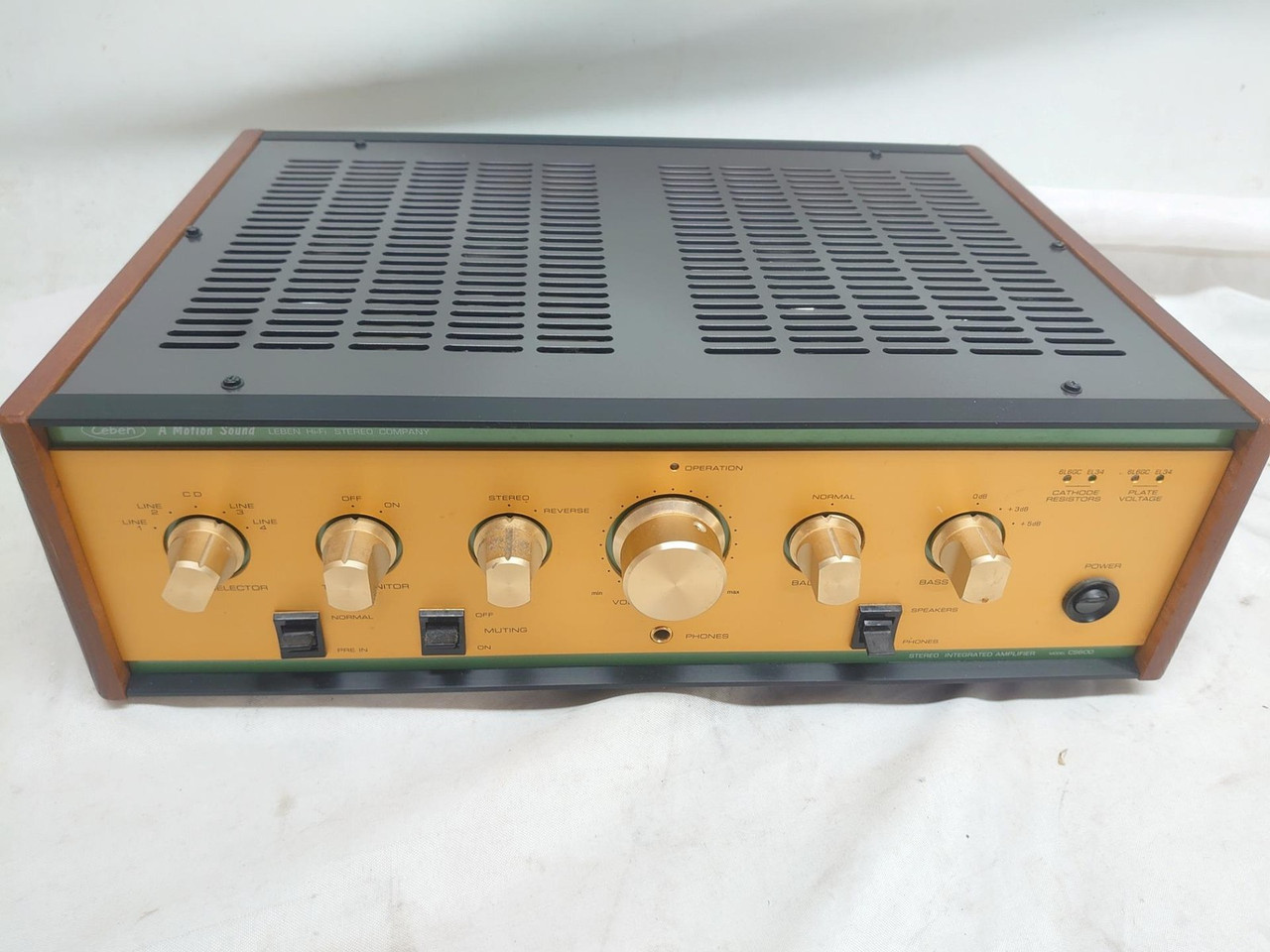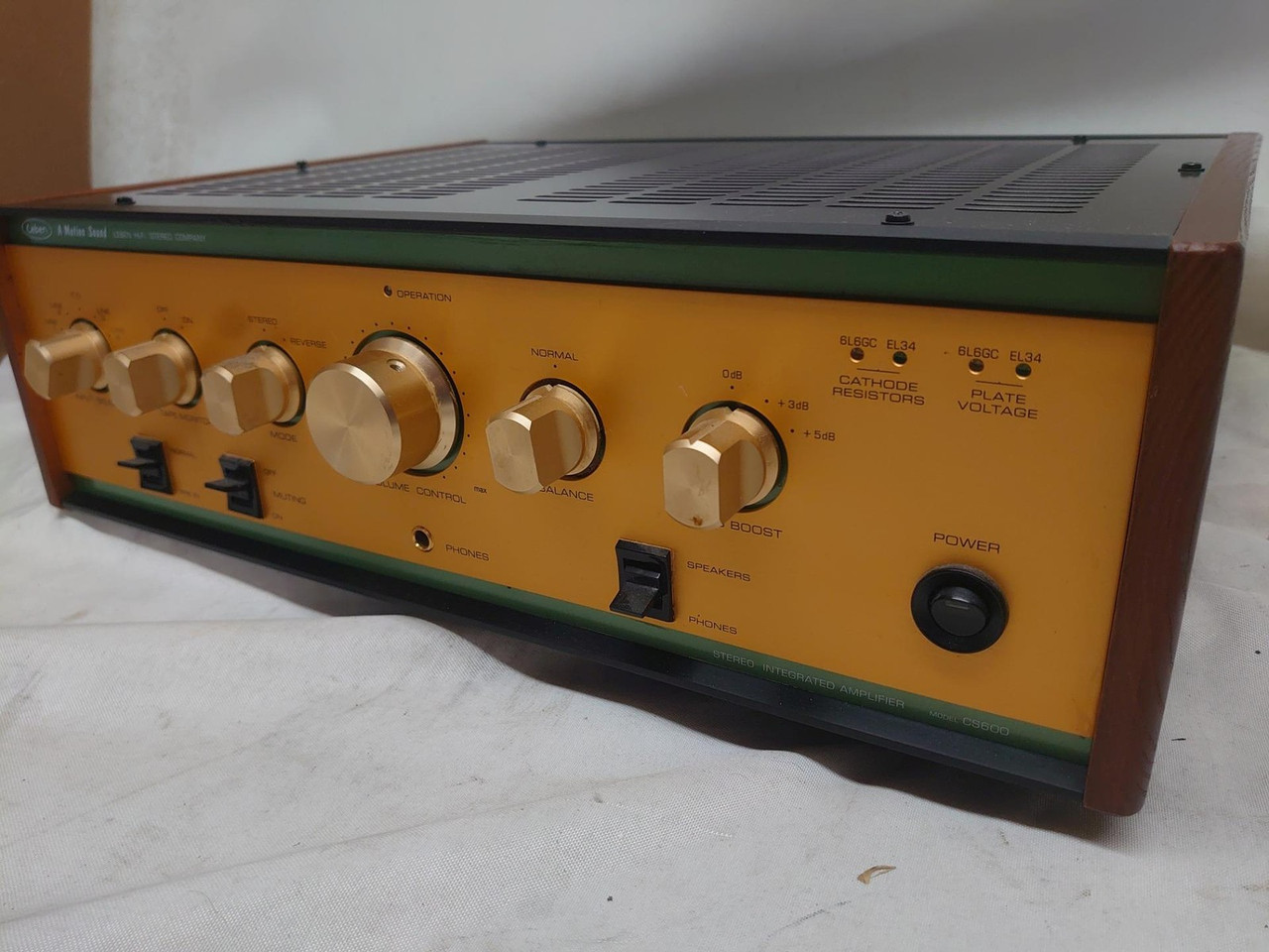 Excellent with output valves and set of ELl34.By switching two selectors inside of the cabinet, you can use either of 6L6GC or 6CA7 (EL34) , and LED indicators on the front panel will show you which tube is applied. CS-600 picture No.2POWER AMPLIFIER DIRECT SWITCH & INPUTS."PREAMP-IN" terminals on the rear panel allow you to use CS-600 as a power amplifier.By switching a selector on thr front panel, by-pass all the functions only excepting a Volume control. A WIDE RANGE OF SPEAKER APPLICATIONMulti output impedance selector: 4/6/8/16 ohms. FLAT AND WIDE FREQUENCY RESPONSEA wide-ranged and flat frequency response upto 100KHz is enough capable for future digital audio format such as SACD/HDCD. CS-600 picture No.3OTHER FEATURESTwin-triode tube 6CS7 for the first-stage amplification.WBT type speaker terminals.Heavy-duty output transformer for 50W grade amplifiers.Large capacity choke-coil: 5H350mADumper tube 6CJ3 (for Colour TV use) is applied to delay a supply of high voltage (B-Voltage) to output tubes in order to protect output tubes from damages and to longer the life.All high-end audio grade electrical components (condensors, resistors)Operation lamp indicatorSucceeding a front design of CS-300/CS-300X.24K Gold-Plated Knobs.Side Wood-Panels.FIVE INPUTSCS-600 IS EQUIPPED WITH 5 LINE INPUTS(RCA unbalanced) PLUS TAPE MONITOR. FULL FUNCTIONS FOR INTEGRATED AMP.Power Amp Direct Switch. (All functions by-pass only excepting Volume control)Muting Switch.Stereo/Reverse Switch.Variable Output Impedance: 4/6/8/16 Ohms.Tape Monitor Switch.Bass Boost Switch.Headphone Output.Speaker/Headphone Selector Switch.Tube Indicator Lamps.Operation Lamp Indicator.CS-600 SPECIFICATIONSTUBES EQUIPPED (4) 6L6GC (, (EL34/6CA7 - Option)(4) 6CS7(1) 6CJ3OUTPUT POWER 32W x 2 (6L6GC) at 1KHz.28W x 2 (EL34) at 1KHz.FREQUENCY RESPONSE 10Hz - 100KHz. (-0.1dB)DISTORTION 0.7%(10W)INPUT SENSITIVITY 900mV at 20WOUTPUT IMPEDANCE 4/6/8/16 Ohms (Selectable)POWER CONSUMPTIONWEIGHT 22.5 Kgs.DIMENSIONS 450 (W) X 360 (D) X 142 (H) mmATTACHMENT Detachable AC Power Cable x 1