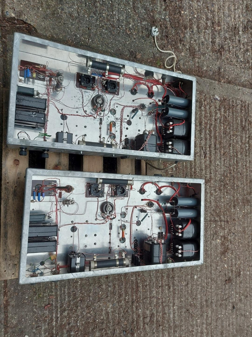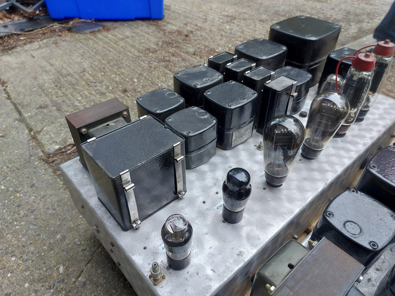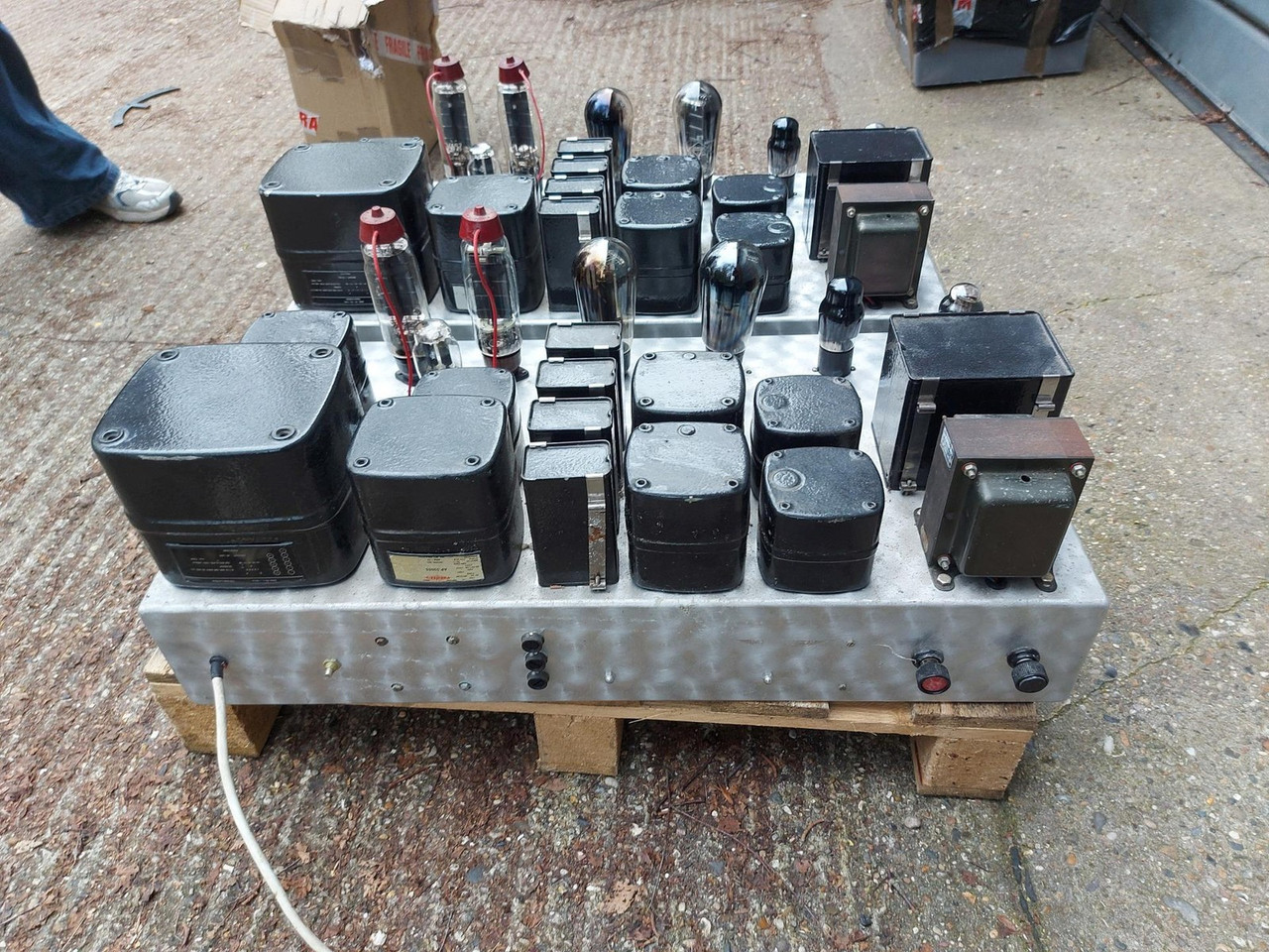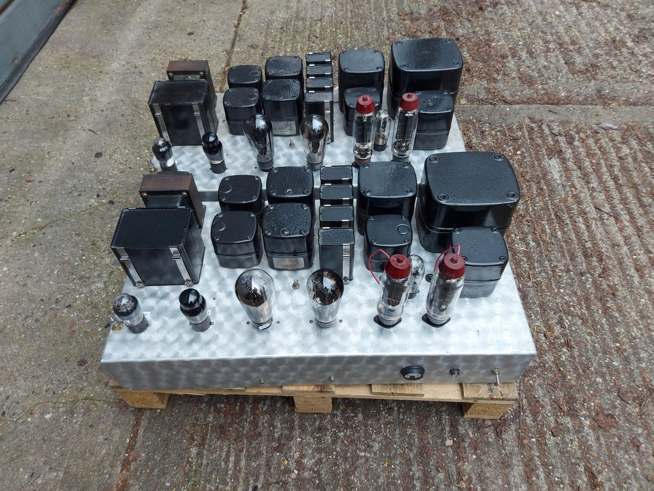 Tek uçlu triyot amfiler.Ev yapımı valf amfileri, Parmeko trafoları ve boğucularla dolu.Eksantrik Noel Bonavia-Hunt tarafından tasarlanan paralel tek uçlu DA30 amplifikatörüDirect yaklaşık 1000v HTolarak bağlanmış. Maalesef bana DA30 çıkış valfleri olmadan geldi (burada bazı PX25'lerle birlikte görümde görülüyor). Vircuit diyagramı dahil. DA30 valf tabanları, anti-mixcrophonics için yaylanacak şekilde zekice değiştirildi.Bu amfilerin birkaç yıl önce John Howes tarafından BVWS yarışmalarından birinde Voight kornaları çalarak gösterildiğini düşünüyorum.Quad II (dahil edilmemiş) bir fotoğrafta gösteriliyor; bu canavarların ölçeği hakkında bir fikir vermek için.Bunların her biri 50 kg'dan fazla!