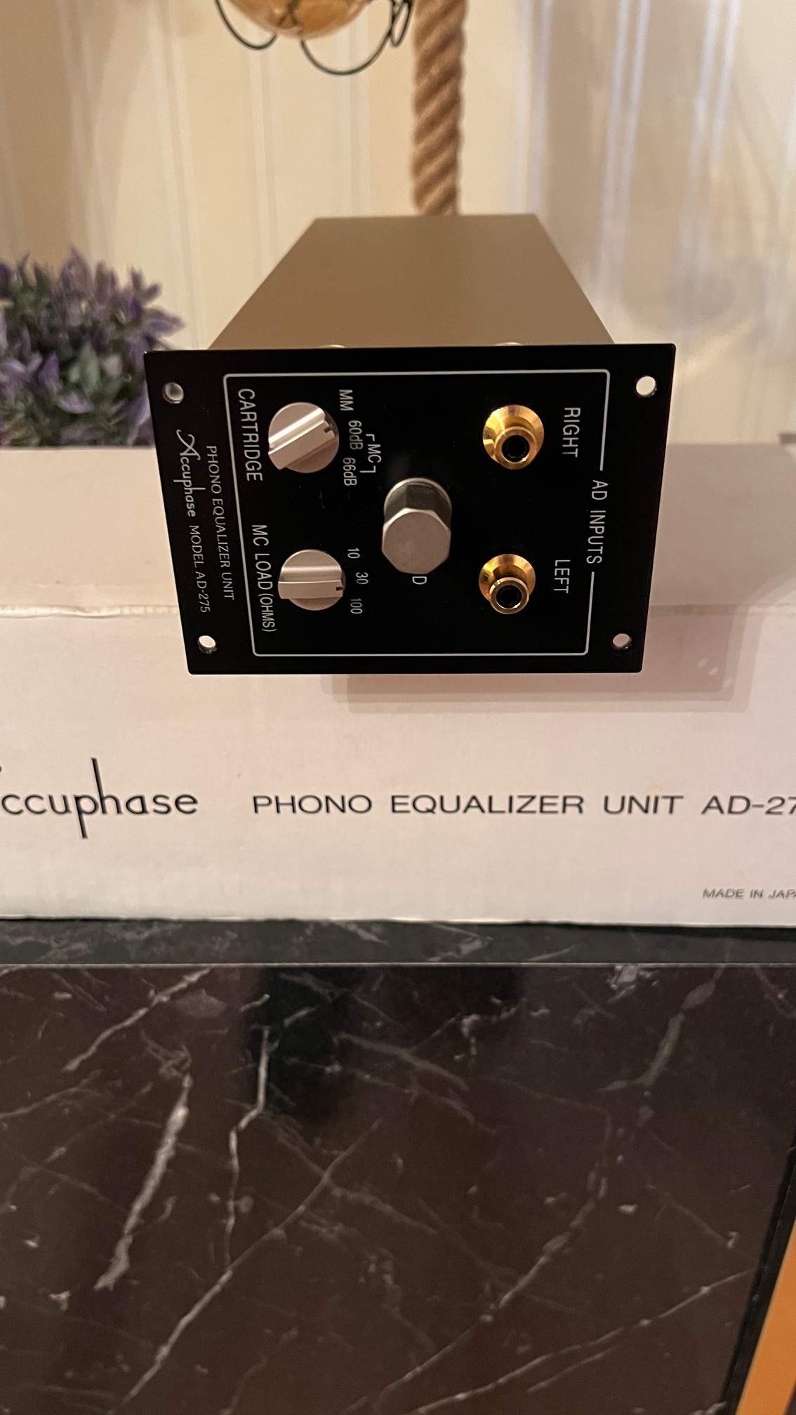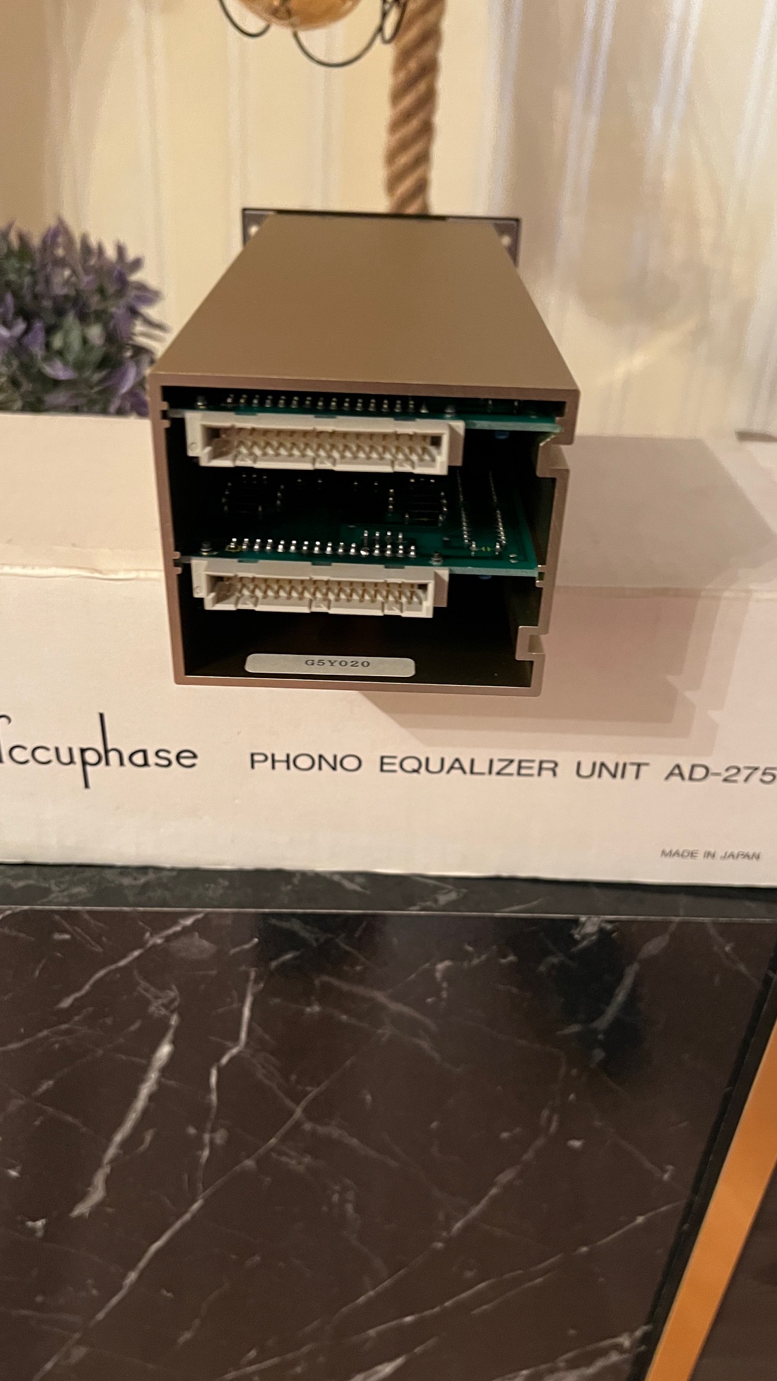 It is the Optional Turntable module sold for the Accuphase C-275 Integrated Amplifier. It does not come across easily, it is no different from zero.There is absolutely no bargaining and bartering.The telephone equalizer unit developed by the Accufaz AD-275C-control amplifier is of 275 exclusive use.Expansion of this unit allows it to play an analog record with the C-275.The current feed bag enlarging circuit is considered the circuit composition.By running the good circuitry of the nudity feature with a bitof NFB and light phase compensation, a natural response and anacoustic field have been achieved.All of these circuits are made up of individual parts so that sound quality is seriously considered.It has input circuitry for special use, taking into account the characteristics of the cartridge of each MM/MC model.It consists of a FET element that can maintain a high input impedancein all frequency bands since the Output voltage of a cartridgeand the Output load impedance is high during MM input and MCinput forms the input circuit by a low-noise element.It receives a very small signal with low impedance.Furthermore, three-stage and profitable two-stage tuning is possible for the MC input in impedance.The used for the printing base of glass epoxy resin coated with goldis AD-275, and it consists of two boards, right and left.It carries an independent constant voltage power supply circuit.Each sheet is stored with strong aluminum housing and the impact from outside is suppressed.It cannot be used with other devices for C-275 specific use.