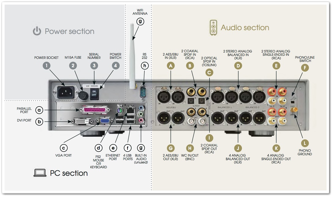 Analoge AudioverbindungSymmetrische Eingänge (XLR): x4Unsymmetrische Eingänge (RCA): x4Symmetrische Ausgänge (XLR): x4Unsymmetrische Ausgänge (RCA): x4Unsymmetrische Ausgänge (RCA): x4Plattenspieler-Eingang (RCA): 1x Stereo (Plattenspieler/Line-Eingang schaltbar)