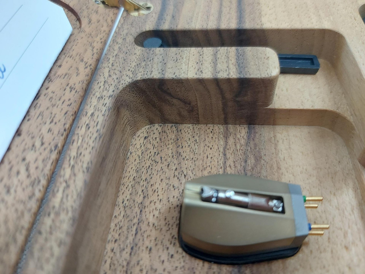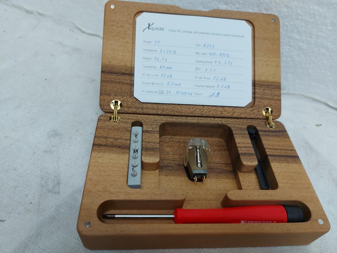 X-Quisite ST Silver MC Cartridge New Old Stock BoxedThe X-Quisite ST is comprised of a silver coil and titanium body. The cartridge uses X-Quisite’s ground-breaking technology to get unprecedented results.All X-quisite cartridges take advantage of the patented monobloc-ceramic transducer technology, which ensures supreme detail resolution and at the same time extremely natural sound. The ST (Silver/Titanium) model features a pure silver coil which has been carefully matched with an advanced titanium-aluminium-wood sandwich-body to achieve most delightful sound characteristics. Each X-quisite cartridge is handmade piece by piece and calibrated by Micha Huber personally.The body is milled out of a massive block and its material is sonically carefully matched to the characteristic of the different models. Between tonearm and cartridge, a carefully matched wooden inlay balances the resonance-properties of the contact area.The ironless coil-design of the X-quisite transducer requires a strong magnet circuit in order to achieve reasonable output voltage. It took X-Quisite many prototype setups and listening sessions before they found the perfect solution to be a Neodym-Armco combination with special measures to reduce eddy current loss to an absolute minimum. The generator is entirely built into an aluminium-holder, ensuring the mechanical energy-flow between tonearm and transducer to be as direct as possible.By combining various modern production methods, they found a way in producing smallest ceramic parts precisely and exactly according their preferences. By designing the cantilever itself partly hollow and with octagonal cross section, they achieve extreme high rigidity for the entire cantilever/coil-body unit.The micro-ridge diamond is exactly fitted into a cross hole of the cantilever and fixed with tiny quantities of a technical adhesive. Overall, the moving mass at the tracking point is with 0,8mg very low for an MC design.The coil material – copper, silver or gold with high purity grade – defines the tonal characteristic of the different X-quisite models. The winding technology is specifically adapted to the ceramic coil-body.The X-quisite cartridge comes carefully packed in a wooden box, made of a walnut tree, grown in their closest neighbourhood in the Tösstal.“…it does mark a breakthrough in the design of moving coil cartridges.” – May 1, 2020 – Audiotechnique Review by Lincoln ChengCantilever and coil bodyMonobloc ceramic unit, patented designCoilPure silver 4NDiamond shapeMicro ridgeMagnet unitNeodym-Armco, reduced eddy current lossBodyTitanium-aluminium-woodConnection1/2″ – 4pin, gold platedVertical Tracking Angle20°Weight16,6gTracking force1,9…2,1gOutput voltage0,3mV @ 5cm/sCompliance12µm/mNBandwidth20 – 30‘000HzFIM disortionmax. 0,2%Impedance2x 20ΩRecommended load400 – 800Ω