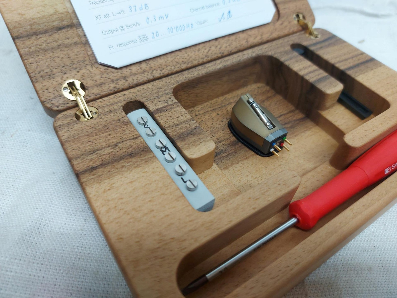 X-Quisite ST Silber MC Patrone Neuer alter Stock BoxedDie X-Quisite ST besteht aus einem silbernen Coil- und Titangehäuse. Die Patrone nutzt die bahnbrechende Technologie von X-Quisite, um beispiellose Ergebnisse zu erzielen.Alle X-quisite-Patronen nutzen die patentierte Monoblock-Keramik-Transducer-Technologie, die eine höchste Detailauflösung und gleichzeitig einen äußerst natürlichen Klang gewährleistet. Das ST-Modell (Silber/Titan) verfügt über eine reine silberne Spirale, die sorgfältig mit einem fortschrittlichen Titan-Aluminium-Holz-Sandwich-Gehäuse kombiniert wurde, um die angenehmsten Klangeigenschaften zu erzielen. Jede X-quisite-Patrone wird Stück für Stück handgefertigt und von Micha Huber persönlich kalibriert.Der Korpus ist aus einem massiven Block gefräst, und sein Material ist klanglich sorgfältig auf die Eigenschaften der verschiedenen Modelle abgestimmt. Zwischen Tonarm und Tonabnehmer balanciert eine sorgfältig abgestimmte Holzeinlage die Resonanzeigenschaften der Kontaktfläche aus.Das eisenlose Spulendesign des X-quisit-Transducers erfordert eine starke Magnetschaltung, um eine angemessene Ausgangsspannung zu erreichen. X-Quisite brauchte viele Prototypen-Setups und Hörsitzungen, bevor sie die perfekte Lösung fanden: eine Neodym-Armco-Kombination mit speziellen Maßnahmen zur Reduzierung des Wirbelstromverlusts auf ein absolutes Minimum. Der Generator ist vollständig in einen Aluminiumhalter eingebaut, sodass der mechanische Energiefluss zwischen Tonarm und Wandler möglichst direkt verläuft.Durch die Kombination verschiedener moderner Produktionsmethoden fanden sie einen Weg, die kleinsten Keramikteile präzise und genau nach ihren Vorlieben herzustellen. Durch die Konstruktion des Cantilever selbst teilweise hohl und mit achteckigem Querschnitt erreichen sie eine extrem hohe Steifigkeit für die gesamte Cantilever/Coil-Body-Einheit.Der Mikro-Grat-Diamant wird genau in ein Querloch des Auskragers eingebaut und mit winzigen Mengen eines technischen Klebstoffs fixiert. Insgesamt ist die bewegte Masse am Tracking-Punkt mit 0,8 mg für ein MC-Design sehr niedrig.Das Coil-Material – Kupfer, Silber oder Gold mit hoher Reinheitsqualität – definiert die tonale Charakteristik der verschiedenen X-quisite-Modelle. Die Wicklungstechnologie ist speziell an den keramischen Spulenkörper angepasst.Die X-quisite-Patrone wird sorgfältig in einer Holzkiste aus Walnussbaum verpackt, die in ihrer nächstgelegenen Nachbarschaft im Tösstal wächst." … es markiert jedoch einen Durchbruch im Design von beweglichen Spulenpatronen." – 1. Mai 2020 – Audiotechnique Review von Lincoln ChengCantilever und SpulenkörperMonobloc Keramikeinheit, patentiertes DesignReinesSilber 4NDiamantformMikro-Rippen-Magnet-EinheitNeodym-Armco, reduzierter WirbelstromverlustKorpusTitan-Aluminium-Holzverbindung1/2" – 4-Pin, vergoldeteVertikaler Verfolgungswinkel20°Gewicht16,6gVerfolgungskraft1,9… 2,1 gAusgangsspannung0,3 mV @ 5 cm/sCompliance12μm/mNBandbreite20 – 30'000 HzFIM-Disortionmaximal. 0,2 % Impedanz2x 20 ΩEmpfohlene Last400 – 800 Ω