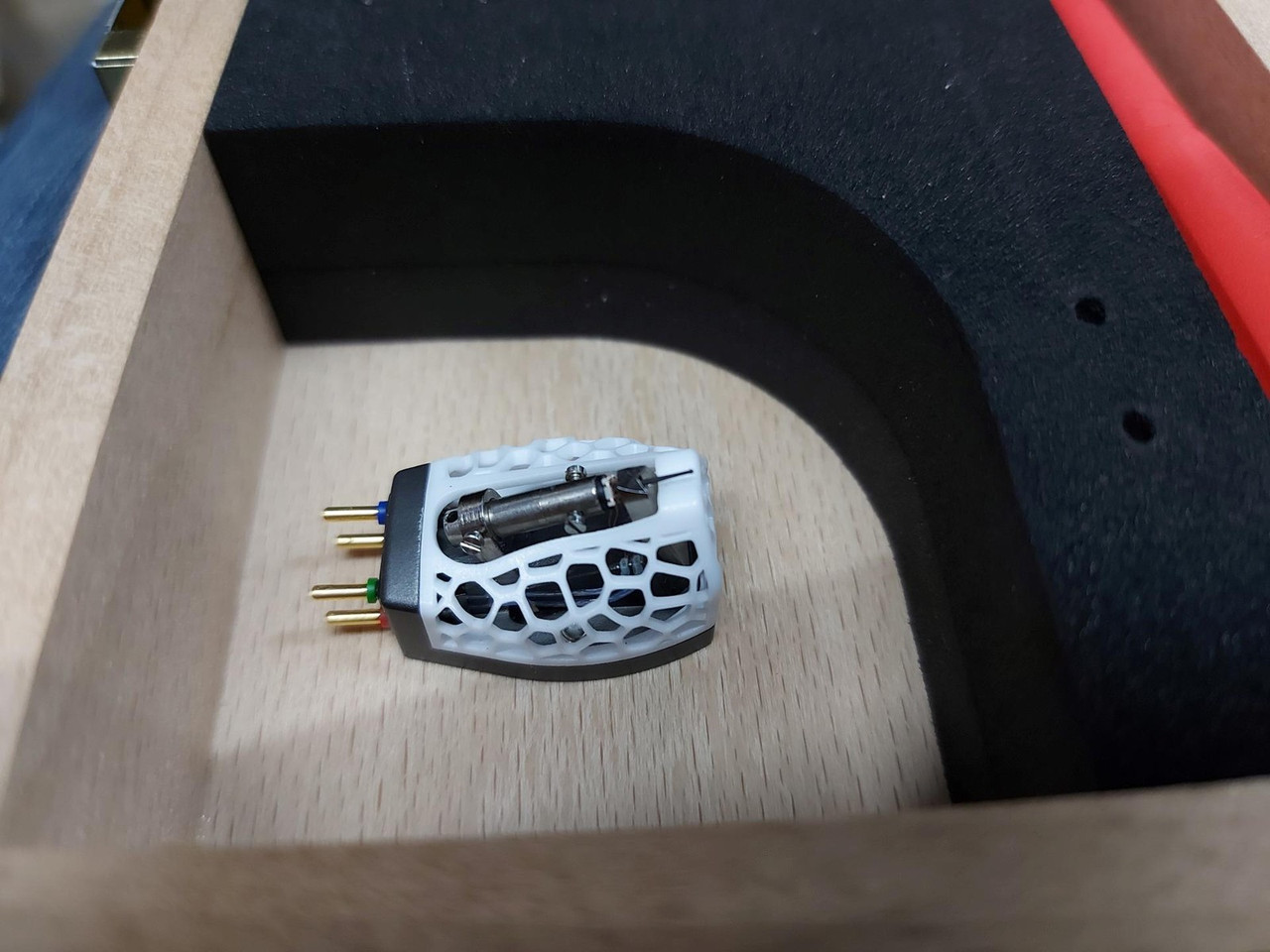 This is a monoblock moving-coil (MC) cartridge that integrates a patented single-piece ceramic cantilever and coil former, eliminating flex at the junctions and ensuring precise signal reproduction. The cartridge body is a skeletonized aluminum chassis encapsulated by a Voronoi-patterned ceramic web, giving it both an organic aesthetic and optimal resonance behavior.Technical SpecificationsWeight: 10.2 gramsCompliance: 12 µm/mNTracking Force: 1.9–2.1 grams recommendedOutput Voltage: 0.7 mV at 5 cm/sInternal Impedance: 12 ohmsRecommended Load: 100–200 ohmsStylus: Fritz Geiger Signature (FGS)Coil Wire: 4N pure copperMagnet: Neodymium with Armco coreFrequency Response: 20 Hz–30 kHzFIM Distortion: 0.2% maximum 3The ceramic cantilever is hollow in parts with an octagonal cross-section, reducing moving mass to just 0.08 mg at the stylus tip, which enhances tracking precision and dynamic response. The cartridge’s monoblock design eliminates joints between the needle carrier and coil body, minimizing acoustic leaks and airborne noise.
