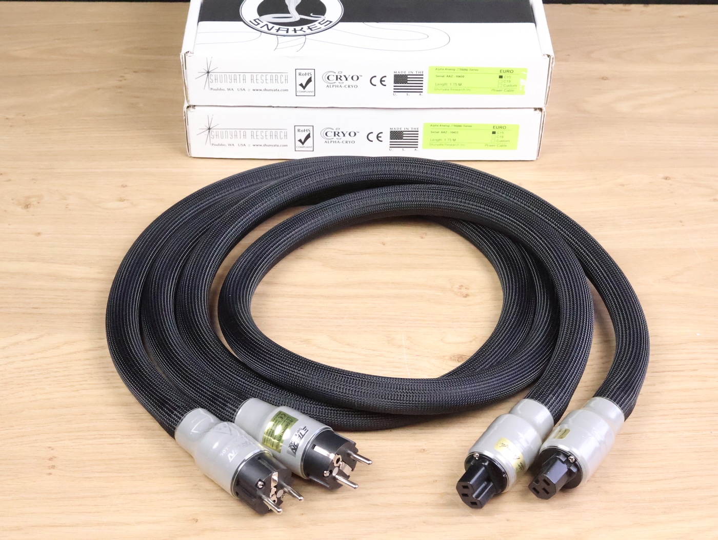 Two Shunyata Research Z-Tron Alpha Analog audio power cables in a fantastic condition. The length of both is 1,75 metre and they have the original connectors (EU wall type and C15 IEC). Serial numbers are AAZ-10430 and AAZ-10433. The original boxes are included. Price is 799 euro for one Alpha Analog cable. Check our other listings for more interesting items. Free shipping worldwide!