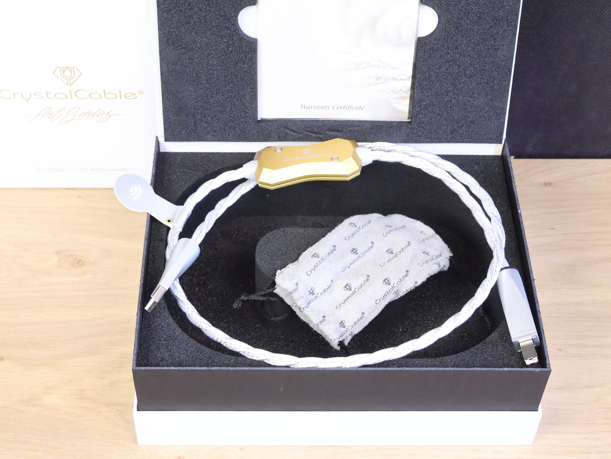 New with 30% high discount! One Crystal Cable Art Series Monet high end silver digital audio USB cable with a length of 1,0 metre. We unboxed it for taking pictures only. It has the original USB connectors (type A to B) and the original box and certificate are included. Retail price is 5.025 euro, now for 3.499 euro only. Check our other listings for more interesting items. Free shipping worldwide!Monet USB boast an extremely low level of distortion and outstanding musical reproduction. It uses unique Infinite Crystal Silver conductors, paired with DuPont Teflon and PTFE insulation to deliver unmatched sound quality. The transparent Teflon jacket adds to the glass-clear sound and serves as a window to the music, as the central conductor forms almost the entire cable. Designed to perform without compromise.