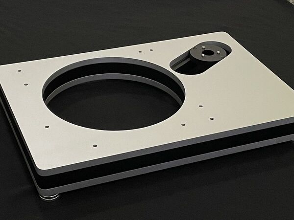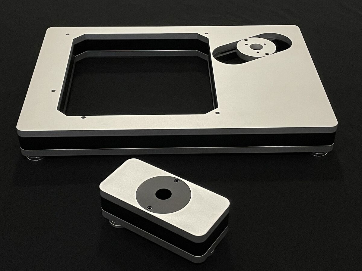 Additional matching tonearm stands are available for pre order from the dropdown menu, these stands can be placed left front or left rear positions and are for 11” + length tonearms left front, and 10” plus tonearms with the possibility of some 9” arms on the rear left position. The stand comes complete with matching alloy feet and arm panel as the plinth, the arm panel is cut for the arm of your choice included in the price. Each stands construction is identical to the plinths construction using solid alloy and delrin billet.