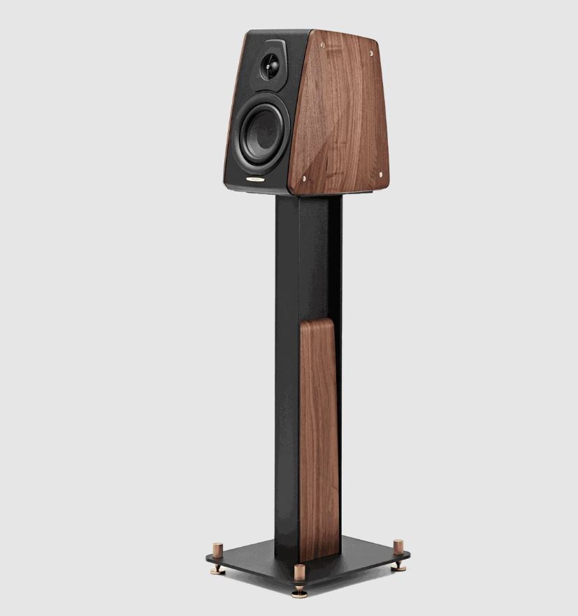 The Iron stand, featuring iron and walnut veneer wood, is designed specifically for the Concertino bookshelf speaker from the Heritage collection.