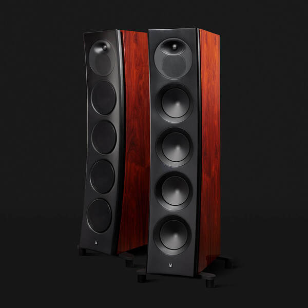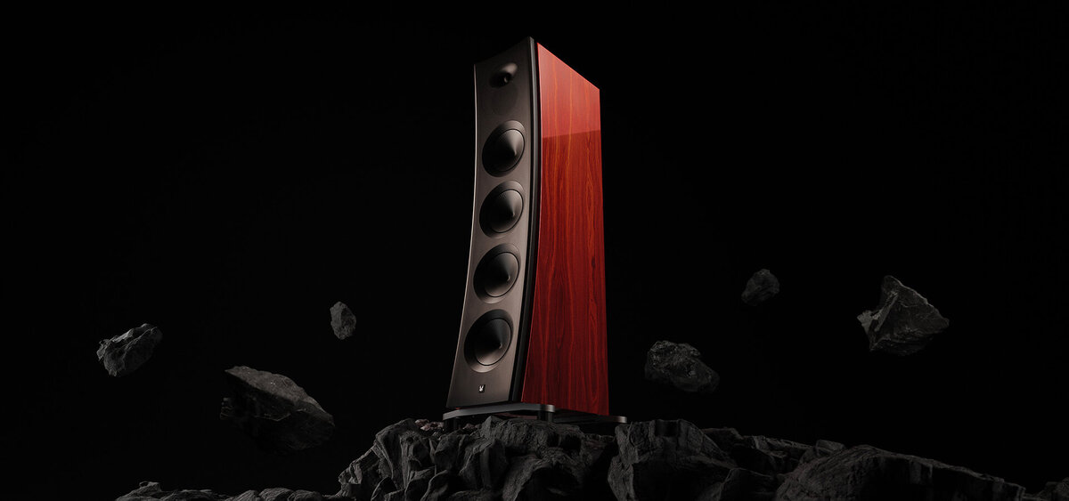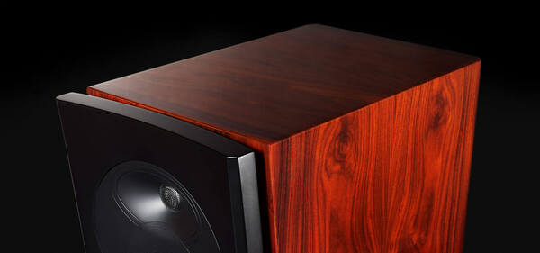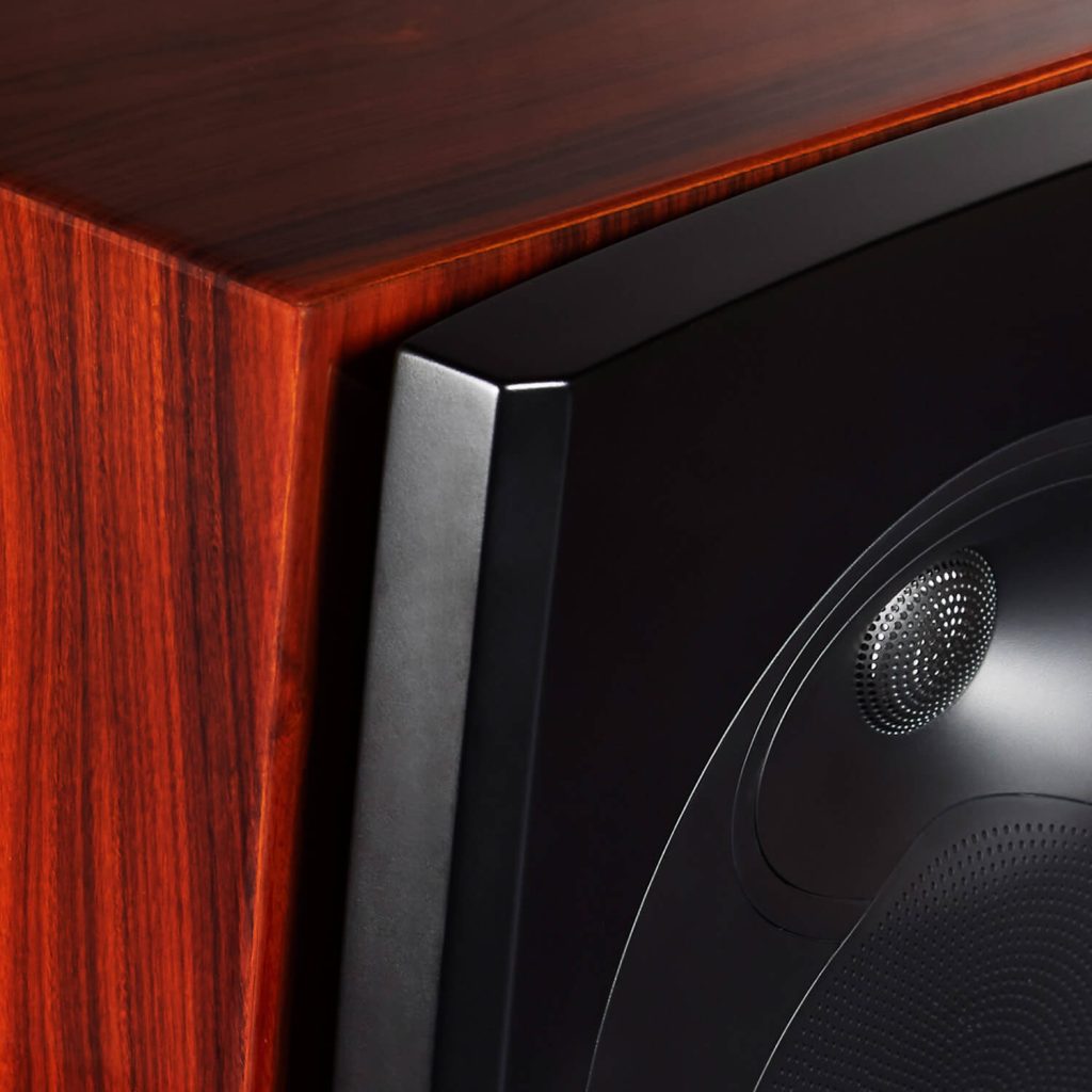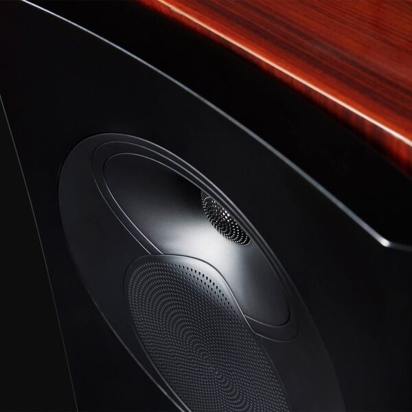 Twelve layers of lacquer, each sanded and polished by hand, reveal a finish that glows with depth and character. Against this warmth, satin-black details on the baffle, waveguide, trim-rings and base bring balance and restraint.
