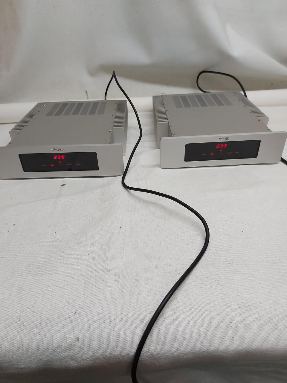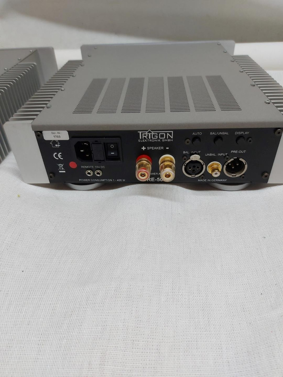 Matched pair, retailed at £3980.With its very slim, stylish and elegant design, the TRIGON TRE 50 M mono power amplifier is one to take your breath away. The over-engineered power supply feeds the symmetrically configured amplifier featuring extremely short signal paths. All protection circuit topology is outside of the signal paths. The sonic character of the TRE 50 is one of authority, fluidity, and upmost musicality - layering, separation, and spatial positioning promote a very holographic and 3 dimensional soundstage. This ingenious design results in a straightforward gain amplification of symmetric or asymmetric input signals, largely preventing the loudspeaker from taking on a life of its own. The TRE 50 M is a true understatement in amplifier design. For added convenience it offers a clearly legible LED display and advanced trigger options. 250 watts into 4 ohmsThe sensational TRE-50 Monoblocks from Trigon Audio, Germany.With its very slim, stylish and elegant design, the TRIGON TRE 50 M mono power amplifier is one to truly take your breath away.The over-engineered power supply feeds the symmetrically configured amplifier - this design features extremely short signal paths, allowing for perfect signal to noise ratio's resulting in a simply staggering performance across all genres.This unique design has also allowed all the protection circuit topology to be outside of the signal paths - therefore ensuring the maximum musicality.The sonic character of the TRE 50 is one of authority, fluidity, and upmost musicality - layering, separation, and spatial positioning promote a very holographic and 3 dimensional soundstage.This ingenious design results in a beautifully organic gain amplification of both single ended and balanced input signals, giving the listener unprecedented levels of insight into his/her music.The TRE 50 M is a true understatement in amplifier design, and one which significantly punches above it's weight.For added convenience it offers a clearly legible LED display and advanced trigger options.Our extensive listening tests, have proved these to be perfect partners for : KEF, B&W, Harbeth, Wilson Benesch, PMC, ATC, Tannoy, Audio Physic, Quad ESL and Martin Logan. Technical dataOutput Power250W / 135W at 4/8 OhmInputs1x RCA, 1x XLRInput Impedance47kOhm (unbal), 22kOhm (bal)Outputs1x Speaker, 1x XLR LineDistortion< 0,03%Frequency Response0,5Hz - 200kHz (-3dB)Noise Voltage50uV (A) unbal Input, 70uV (A) bal InputWeight23,5 kgWeight10,1 kg/td>Excellent.Superb amplifiers that create a fabulous soundstage that is fluid, tactile and transparent without ever sounding hard or grainy. 100wpc of high quality mosfet loveliness will drive most speakers. edings and holds you there. Excellent condition with boxesHighly recommended*****RRP: £3500 GBP
