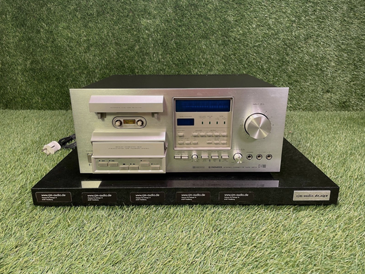 Pioneer CT-F900 Vintage Tapedeck der Spec Serie.Optisch wie technisch in gutem Zustand! Der Pioneer CT-F 900 ist ein Kassetten-Tape-Deck, das in den Jahren 1978 bis 1979 hergestellt wurde. Es handelt sich um ein Gerät ohne Fernbedienungsfunktion. Die Leistungsaufnahme beträgt 44 Watt, während die Abmessungen bei 420 mm Breite, 187 mm Höhe und 375 mm Tiefe liegen. Mit einem Gewicht von etwa 11 kg ist das Gerät solide gebaut. Der Neupreis lag bei rund 1.300 Deutsche Mark. In Bezug auf die Anschlussmöglichkeiten bietet das CT-F 900 eine DIN-Buchse für Rec/Play mit einer Empfindlichkeit von 12 mV. Des Weiteren gibt es Eingänge, darunter 2 Mikrofoneingänge mit 0,3 mV oder 100 mV Empfindlichkeit (30 kOhm) sowie ein Line-Eingang mit 60 mV Empfindlichkeit. Bezüglich der Ausgänge verfügt das Gerät über Line-Ausgänge mit 450 mV oder 640 mV Empfindlichkeit und 50 kOhm Impedanz, sowie einen Kopfhörerausgang mit einer Empfindlichkeit von 63-90 mV bei 8 Ohm über eine 6,3 mm Klinkenbuchse. Der Antrieb des CT-F 900 erfolgt mittels zweier Motoren: einem DC-Servomotor für das Capstan und einem weiteren DC-Servomotor für den Schnellauf (Reel). Die Gleichlaufschwankung beträgt nur 0,04 % WRMS, und die Umspulzeit für eine C-60 Kassette liegt bei 85 Sekunden. Das Gerät verfügt über insgesamt drei Tonköpfe, wobei einer davon ein Löschkopf ist und die anderen beiden für Aufnahme und Wiedergabe (Doppelkopf) dienen. Der Klirrfaktor des CT-F 900 beträgt lediglich 1,3 % (0 dB). Zudem ist Dolby NR integriert. Das Gerät unterstützt Bandsortenumschaltung mit den Typen I (Normal), II (CrO2) und III (FeCr) für Chromautomatik. Der Frequenzgang variiert je nach Bandtyp, wobei er bei Typ I von 20 Hz bis 17.000 Hz, bei Typ II von 20 Hz bis 19.000 Hz und bei Typ III ebenfalls von 20 Hz bis 19.000 Hz reicht. Der Signal-Rausch-Abstand liegt bei Dolby ausgeschaltet bei 54 dB und bei Dolby eingeschaltet bei 64 dB. Die Bestückung umfasst 63 Transistoren, 71 Dioden, 13 ICs und einen Photo-Unterbrecher. Zu den besonderen Ausstattungsmerkmalen des CT-F 900 gehören ein Monitor-Schalter für die Hinterbandkontrolle, eine Aussteuerungsanzeige mit umschaltbaren LED-Anzeigesegmenten für Peak, Peak-Hold und Average, eine Steuerung über Mikroprozessor, Memory-Stop/Play-Funktion, die Möglichkeit zum Anschluss einer Schaltuhr für Aufnahme und Wiedergabe, variable Bias-Einstellung, separate Mikrofoneingänge für links und rechts, ein dreistelliges elektronisches Bandzählwerk (keine Echtzeit) sowie eine automatische Bandsorten-Erkennung. Darüber hinaus sind Tipptasten vorhanden.