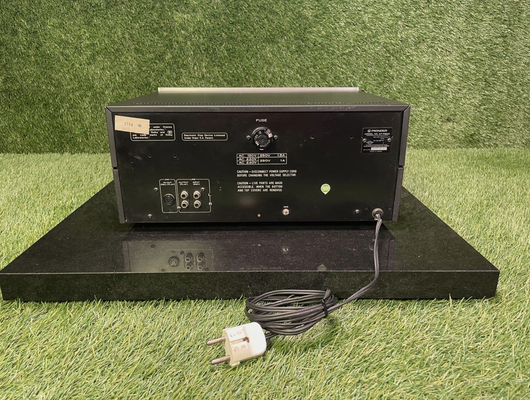 Pioneer CT-F900 Vintage Tape Deck of the Spec Series.Visually and technically in good condition! The Pioneer CT-F 900 is a cassette tape deck that was manufactured in the years 1978 to 1979. It is a device without a remote control function. The power consumption is 44 watts, while the dimensions are 420 mm wide, 187 mm high and 375 mm deep. With a weight of about 11 kg, the device is solidly built. The new price was around 1,300 German marks. In terms of connectivity options, the CT-F 900 offers a DIN socket for Rec/Play with a sensitivity of 12 mV. There are also inputs, including 2 microphone inputs with 0.3 mV or 100 mV sensitivity (30 kOhms) and a line input with 60 mV sensitivity. In terms of outputs, the device has line outputs with 450 mV or 640 mV sensitivity and 50 kOhm impedance, as well as a headphone output with a sensitivity of 63-90 mV at 8 ohms via a 6.3 mm jack. The CT-F 900 is driven by two motors: a DC servo motor for the Capstan and another DC servo motor for the fast run (Reel). The synchronization fluctuation is only 0.04% WRMS, and the rewinding time for a C-60 cassette is 85 seconds. The device has a total of three sound heads, one of which is an erasing head and the other two are used for recording and playback (double head). The distortion factor of the CT-F 900 is only 1.3% (0 dB). Dolby NR is also integrated. The device supports belt type switching with types I (Normal), II (CrO2) and III (FeCr) for chrome automatic. The frequency response varies depending on the type of band, ranging from 20 Hz to 17,000 Hz for Type I, from 20 Hz to 19,000 Hz for Type II, and from 20 Hz to 19,000 Hz for Type III. The signal-to-noise ratio is 54 dB when Dolby is turned off and 64 dB when Dolby is turned on. The equipment includes 63 transistors, 71 diodes, 13 ICs and a photo interrupter. The special features of the CT-F 900 include a monitor switch for backband control, a level display with switchable LED display segments for peak, peak hold and average, microprocessor control, memory stop/play function, the possibility of connecting a timer for recording and playback, variable bias setting, separate microphone inputs for left and right, a three-digit electronic tape counter (no real time) and automatic tape type recognition. In addition, there are tap buttons.