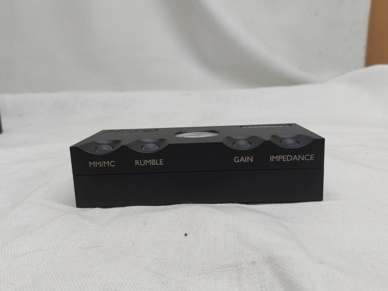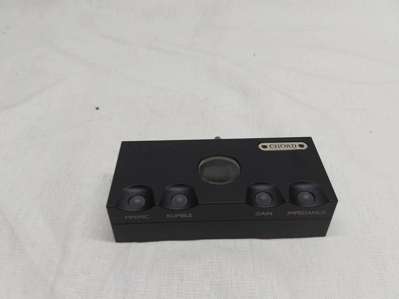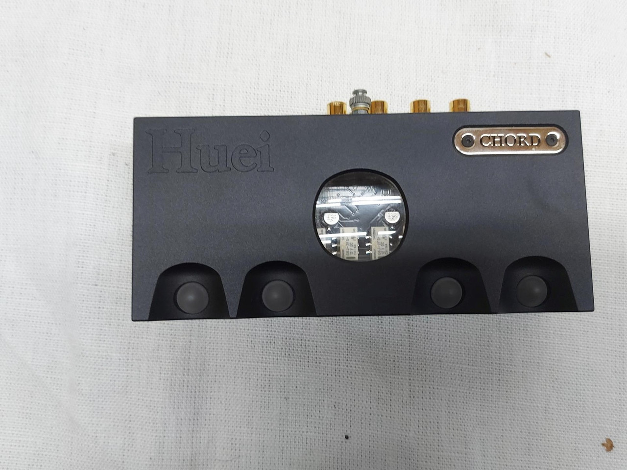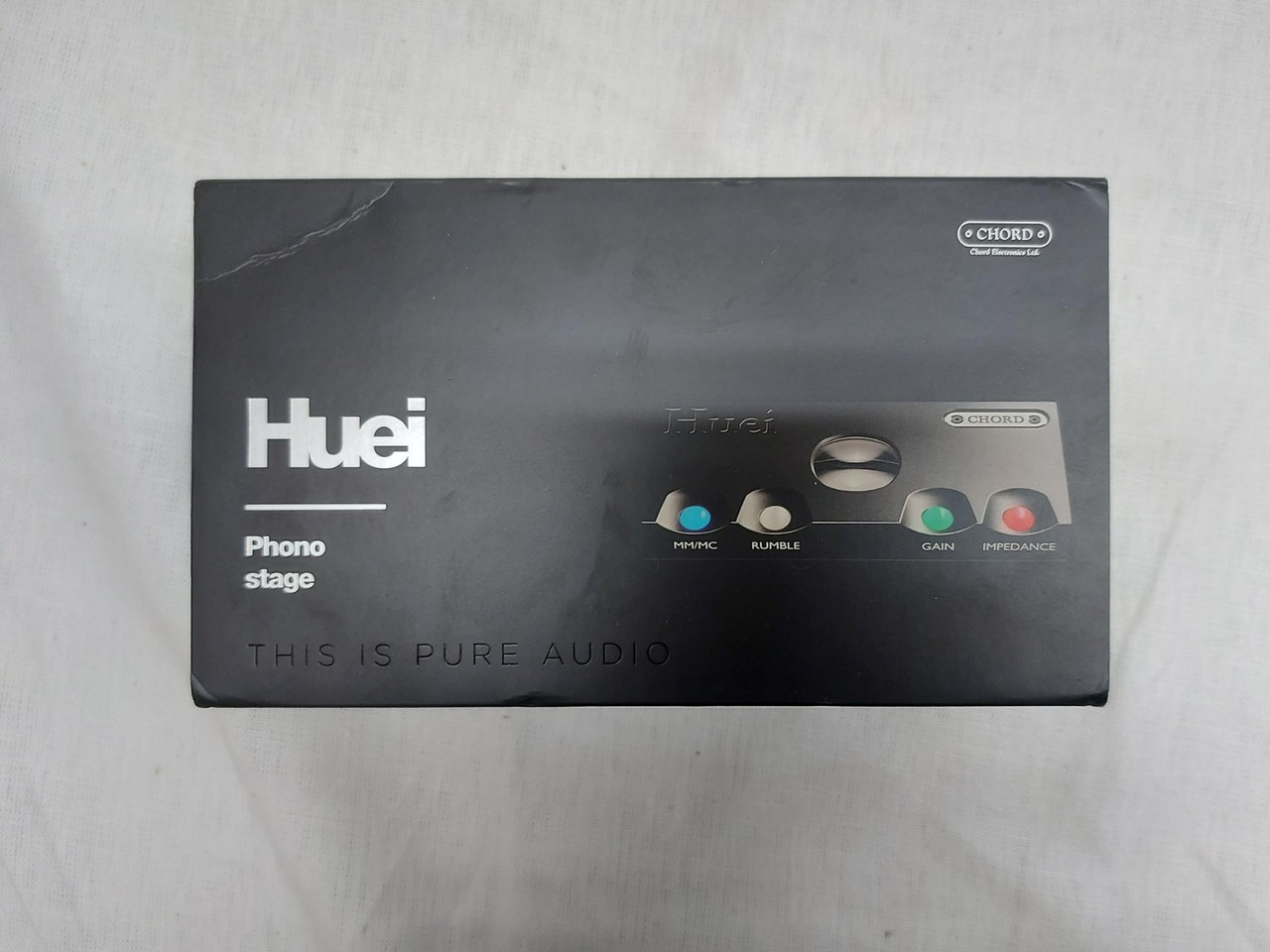 Very good.Newly unveiled by Chord Electronics, Huei is a multi-cartridge compatible phono stage in the compact Qutest chassis. Keeping with Chord Electronic's usual high standards of design and manufacture, Huei offers support for a wide range of cartridges due to its capability of switching between Moving Magnet/Moving Coil cartridges, alongside various gain and impedance options selectable via the easily accessible front controls. Here is what Chord Electronics say about the HueiHuei is a compact phono stage that offers both MM and MC compatibility allowing turntables to integrate into amplifiers with ease. Entirely conceived, engineered and manufactured in Great Britain, Huei has been carefully designed to provide turntables with the same high standards of amplification that Chord Electronics has become known for over the past 30 years. Benefitting from both Moving Magnet and Moving Coil functionality, Huei offers compatibility with a huge range of cartridges thanks to comprehensive gain and impedance-matching options; Huei’s high- and low-gain switching settings are easily accessible via front-panel controls, introducing welcome flexibility. Huei’s advanced design offers (for the first time in a Chord Electronics phono preamp) ultra-low-noise microprocessor control of its main features, including a convenient memory function. With multiple options for impedance-matching, seven-stage switchable gain and a switchable rumble filter, Huei’s design offers comprehensive compatibility. Precision-machined from solid aircraft-grade aluminium billet, Huei has a similar form factor to the company’s Qutest DAC and also offers a top-mounted viewing window into the illuminated electronics within. The design also shares the same polychromatic control spheres the company has become known for in its digital products. The illuminated front-panel spheres offer direct access to Huei’s gain and impedance settings, selection for MM/MC cartridges and access to the on-board rumble filter. Huei is a stylish, practical and high-performance solution for integrating turntables into Chord Electronics’ (and other) systems and features both balanced (RCA) and unbalanced outputs (XLR) with RCA inputs. A high-quality 12V external power supply is also supplied. FeaturesSupports both Moving Magnet and Moving Coil cartridgesSelectable impedance: 30Ω, 100Ω, 5kΩ, and 4.7pfSelectable gain: 60dB, 65dB, and 70dBStereo unbalanced RCA inputsStereo unbalanced RCA outputs and Stereo balanced XLR OutputsCountry of manufacture: England "The Chord Huei is a good place to start. And, I think, a good place to stop. This just might be the last phono stage you’ll ever need or want." (Read More) Equipment Review - ecoustics - March 2021 "With Ortofon’s Cadenza Bronze moving coil cartridge Huei set up a big wide sound stage in front of me.There was no hiss or hum, just perfect silence until needle hit the groove. Spinning Fanfare for the Common Man, from Two Countries One Heart - an all-analogue and well balanced 180gm LP - kettle drum strikes were fast and clean, having plenty of visceral power. Brass blared with fruity impact and the whole performance strode along with good pace. Intrigued by the novel Rumble filter I pressed it on and off and bass power was unaffected, kettle drum losing no impact." (Read More) Hi-Fi World - 4 World Review - 2020 "There's plenty to like about the stereo imaging, which is open and stable. Instruments and sounds are confidently placed in the decently sized soundstage and don't wander as the music becomes more demanding. There's a pleasing lack of hardness and edge to the sound, which makes it easy to sit in front of for hours on end." (Read More) What Hi-Fi? 4 Star Review - December 2019 “The Huei is all about clarity and space, rather than how well it smoothes out your forward-sounding cartridge or sweetens up your scratchy records. The Chord's wide open, glass-clear midband integrates smoothly with a strong bass and crisp, extended treble. This makes for a very neutral reading of whatever LP you care to play, with the unusual combination of a well lit and highly revealing upper midband, and very low record surface noise.” Stereonet 5 Star Applause Award - November 2019 SpecificationInput impedance: 30Ω – 47kΩ, 50pF – 150pFInput noise: 1.1nV/HzMax output voltage RMS: 10v RMSEqualisation gain range: 0dBV – 75dBVEqualisation response: RIAA CurveEqualisation accuracy: +/- 0.1dBFrequency response: RIAA Curve = 12Hz to 25kHzRumble filter: Rausch Slope -24dB per octave below 50HzOutput impedance: 520Ω (resistive)Input power supply: 12v – 100v to 240v 50/60Hz PSUWeight: 770gDimensions: 160mm (W) x 43mm (D) x 72mm (H)Boxed Weight: 1500g