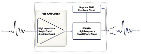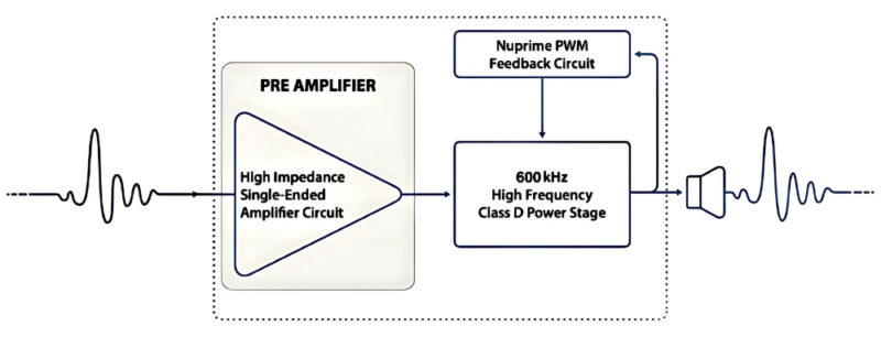 2.Advanced Class D Switching Circuit – The high-performance Class D switching MOSFET circuit operates at 600 kHz, enabling high-resolution audio performance while reducing operating temperature by 30%. This thermal efficiency allows for greater headroom and produces a more effortless, natural sound reproduction.